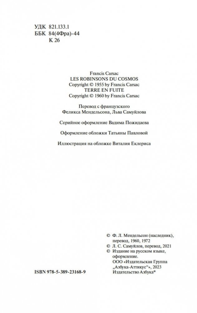 Франция не очень фантастическая страна по сравнению, например, с Америкой или Англией. Кого, кроме Жюля Верна, вы можете вспомнить из французских фантастов? Почти никого. Рони-старший с его «Борьбой за огонь», Морис Ренар, Жерар Клейн… Кто еще? Но есть в фантастике Франции имя, которое наш отечественный читатель знает наверняка, — это Франсис Карсак. Роман «Робинзоны космоса», переведенный и опубликованный в нашей стране в самом начале 1960-х, сразу же вывел Карсака на одно из ведущих мест в рейтинге симпатий российских читателей. Вселенская катастрофа, кусок планеты отрывается от Земли, и люди, на нем живущие, оказываются в миллионах километров от дома, в мире, который нужно освоить и покорить. Роман «Бегство Земли» — история человека из далекого будущего, рассказавшего людям современной эпохи о том, какая беда поставит под угрозу планету и как правнуки ради спасения человечества решатся на грандиозный эксперимент — «побег» Земли на орбиту чужого солнца.