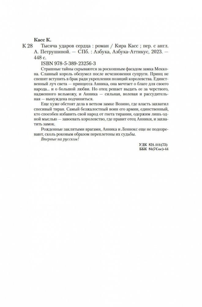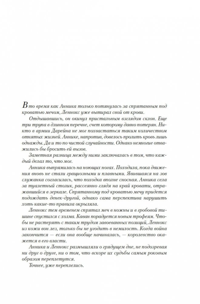 Страшные тайны скрываются за роскошным фасадом замка Меккона. Славный король обезумел после исчезновения супруги. Принц не спешит вступить в брак ради укрепления позиций королевства. Единственный луч света — принцесса Анника, она мечтает о благе для своего народа… и о большой любви. Но отец решает выдать ее за черствого, надменного вельможу, и Анника — сильная, волевая и рассудительная — вынуждена подчиниться. Еще хуже обстоят дела в ветхом замке Возино, где власть захватил спесивый тиран. Самый безжалостный воин его армии, единственный, кто способен избавить свой народ от гнета тирании, одержим лишь одной мыслью — завоевать королевство, где правит отец Анники, и захватить замок. Рожденные заклятыми врагами, Анника и Леннокс еще не подозревают, сколь роковым образом переплетены их судьбы. Впервые на русском!