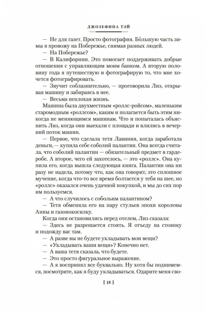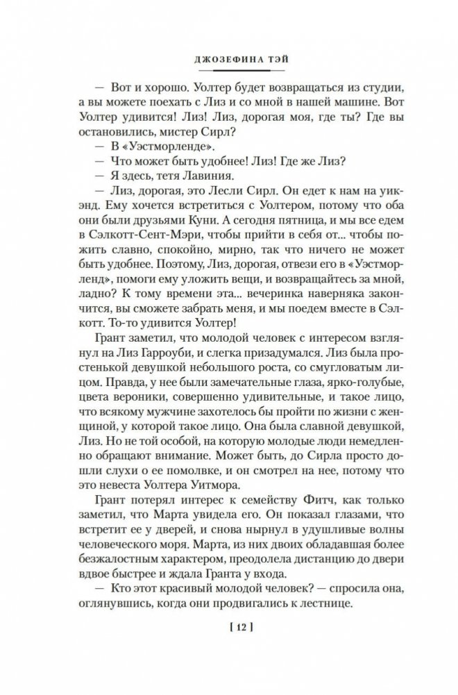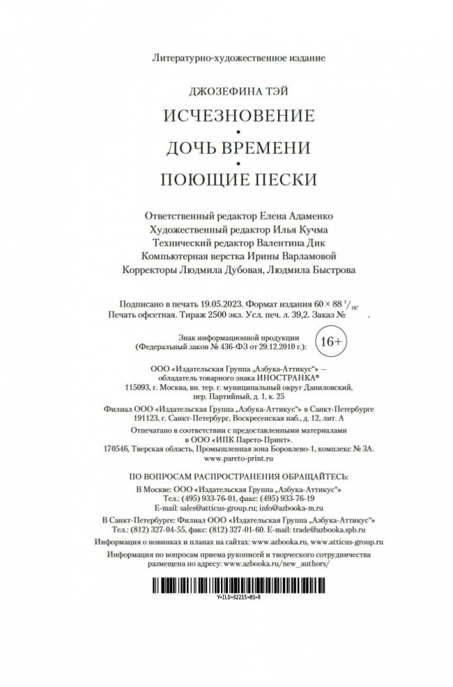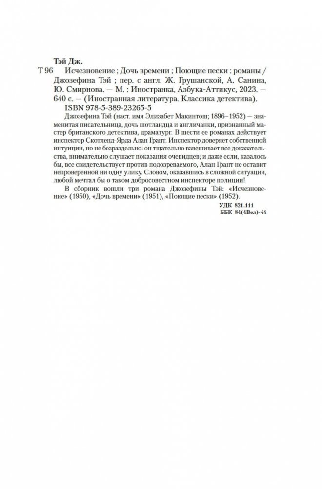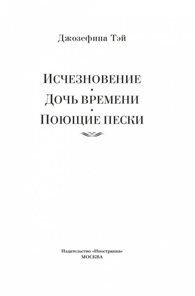 Джозефина Тэй (наст. имя Элизабет Макинтош; 1896–1952) — знаменитая писательница, дочь шотландца и англичанки, признанный мастер британского детектива, драматург. В шести ее романах действует инспектор Скотленд-Ярда Алан Грант. Инспектор доверяет собственной интуиции, но не безраздельно: он тщательно взвешивает все доказательства, внимательно слушает показания очевидцев; и даже если, казалось бы, все свидетельствует против подозреваемого, Алан Грант не оставит непроверенной ни одну улику. Словом, оказавшись в сложной ситуации, любой мечтал бы о таком добросовестном инспекторе полиции! В сборник вошли три романа Джозефины Тэй: «Исчезновение» (1950), «Дочь времени» (1951), «Поющие пески» (1952).