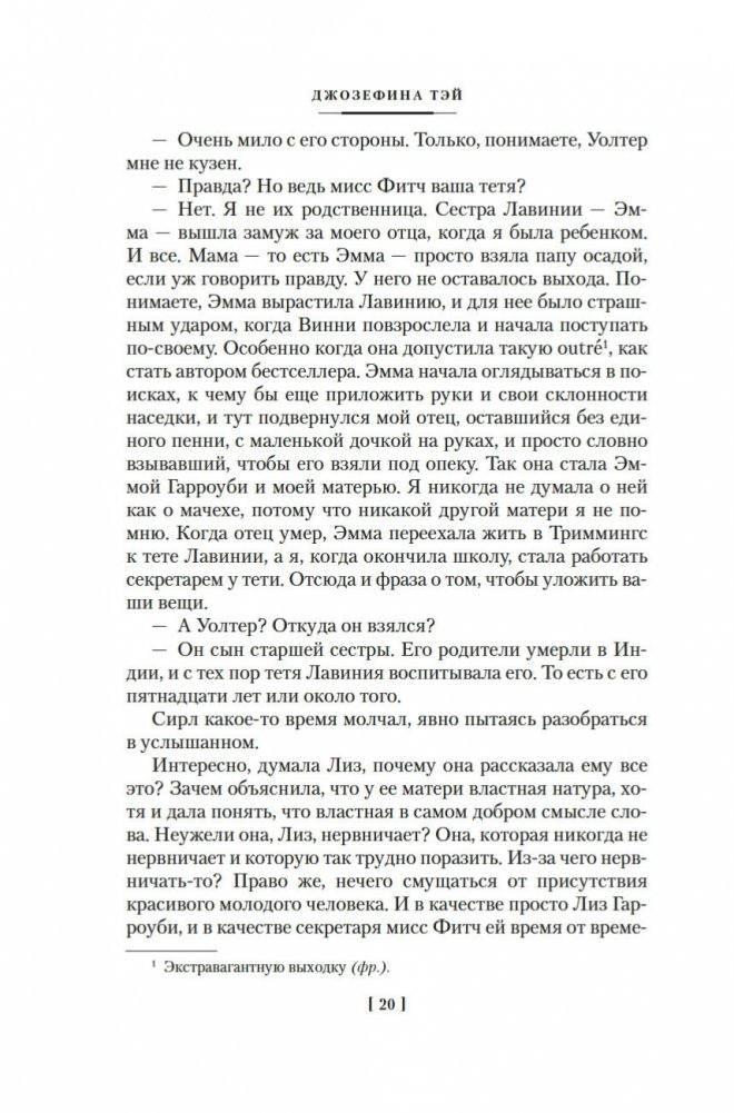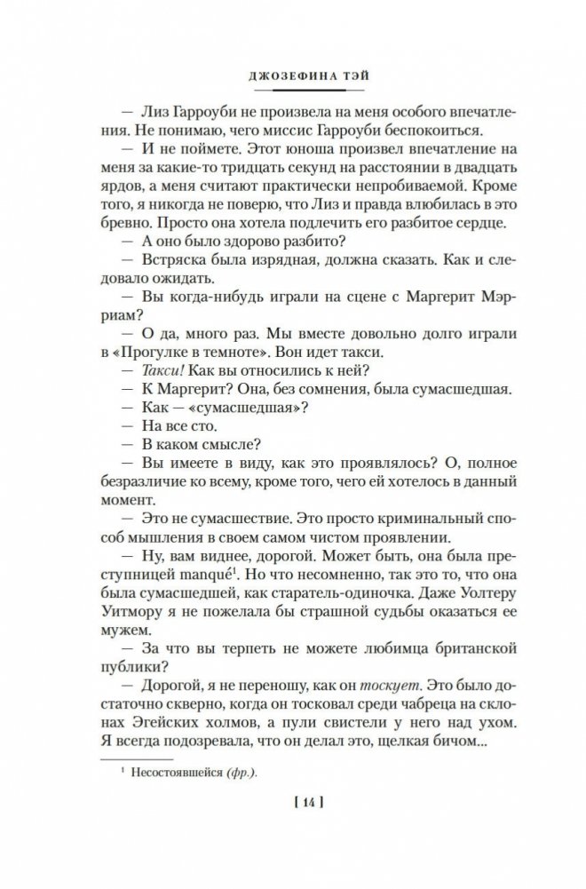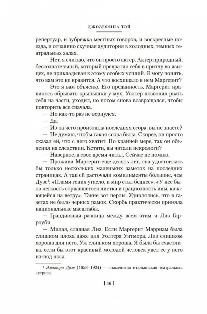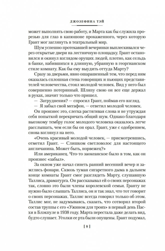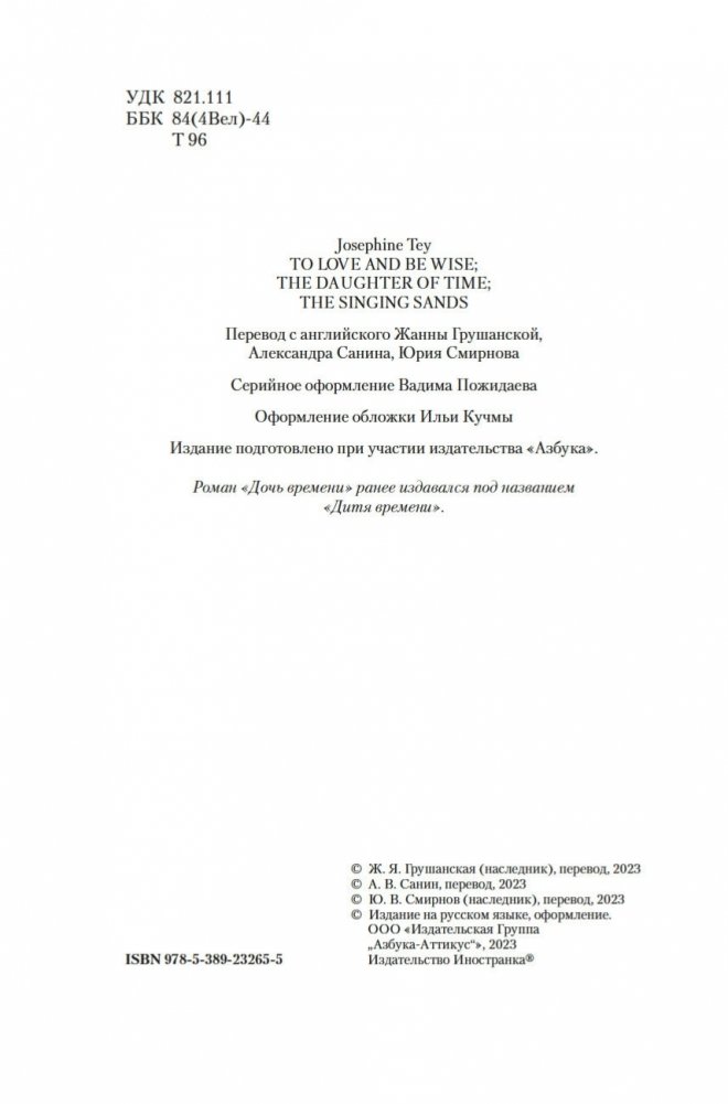 Джозефина Тэй (наст. имя Элизабет Макинтош; 1896–1952) — знаменитая писательница, дочь шотландца и англичанки, признанный мастер британского детектива, драматург. В шести ее романах действует инспектор Скотленд-Ярда Алан Грант. Инспектор доверяет собственной интуиции, но не безраздельно: он тщательно взвешивает все доказательства, внимательно слушает показания очевидцев; и даже если, казалось бы, все свидетельствует против подозреваемого, Алан Грант не оставит непроверенной ни одну улику. Словом, оказавшись в сложной ситуации, любой мечтал бы о таком добросовестном инспекторе полиции! В сборник вошли три романа Джозефины Тэй: «Исчезновение» (1950), «Дочь времени» (1951), «Поющие пески» (1952).