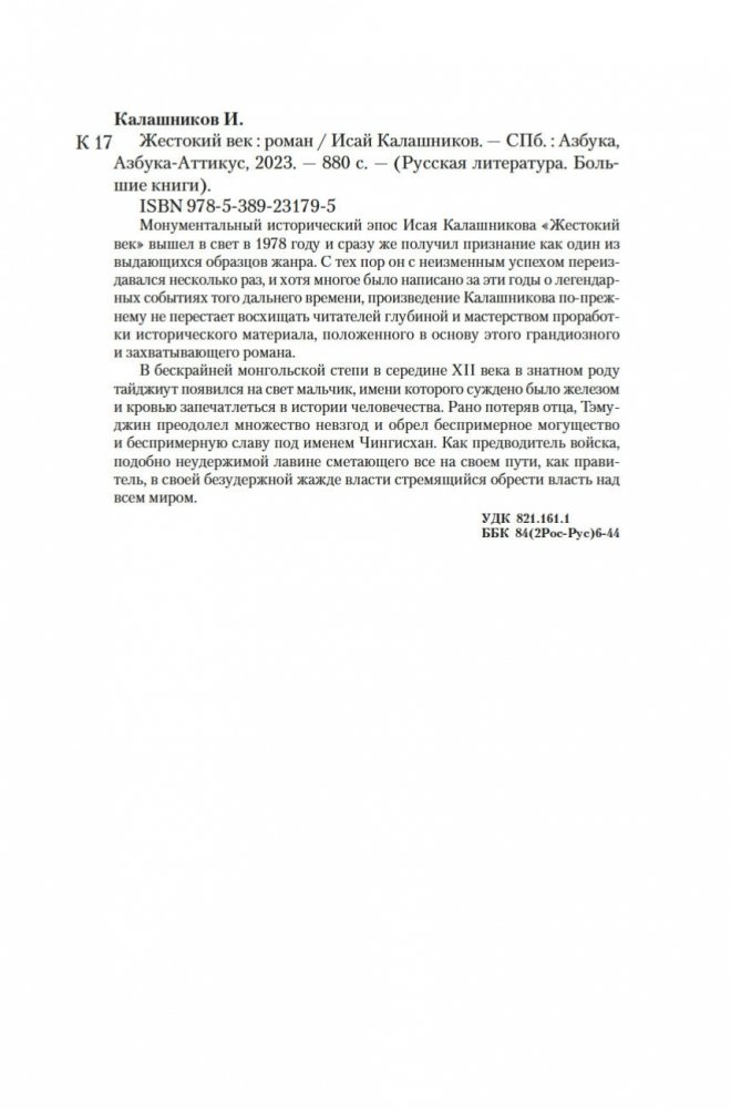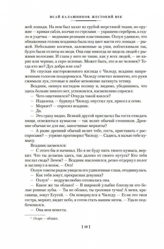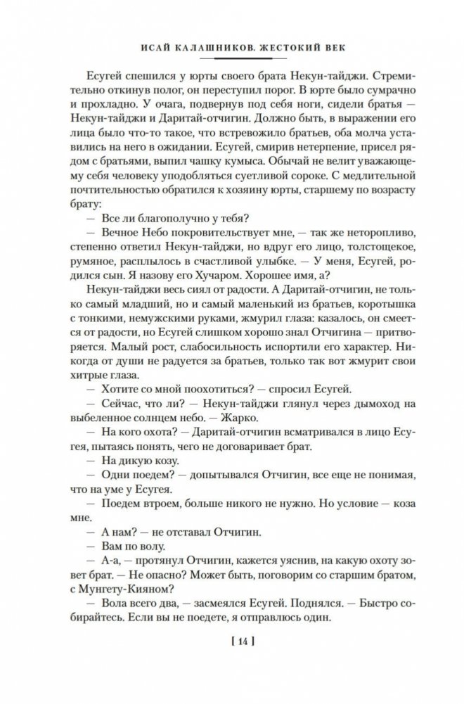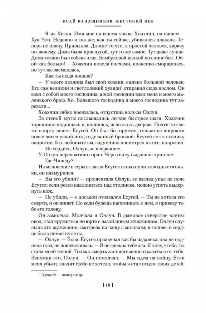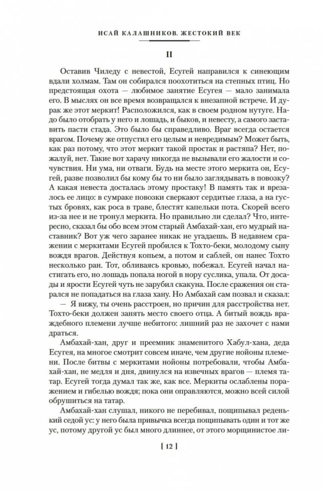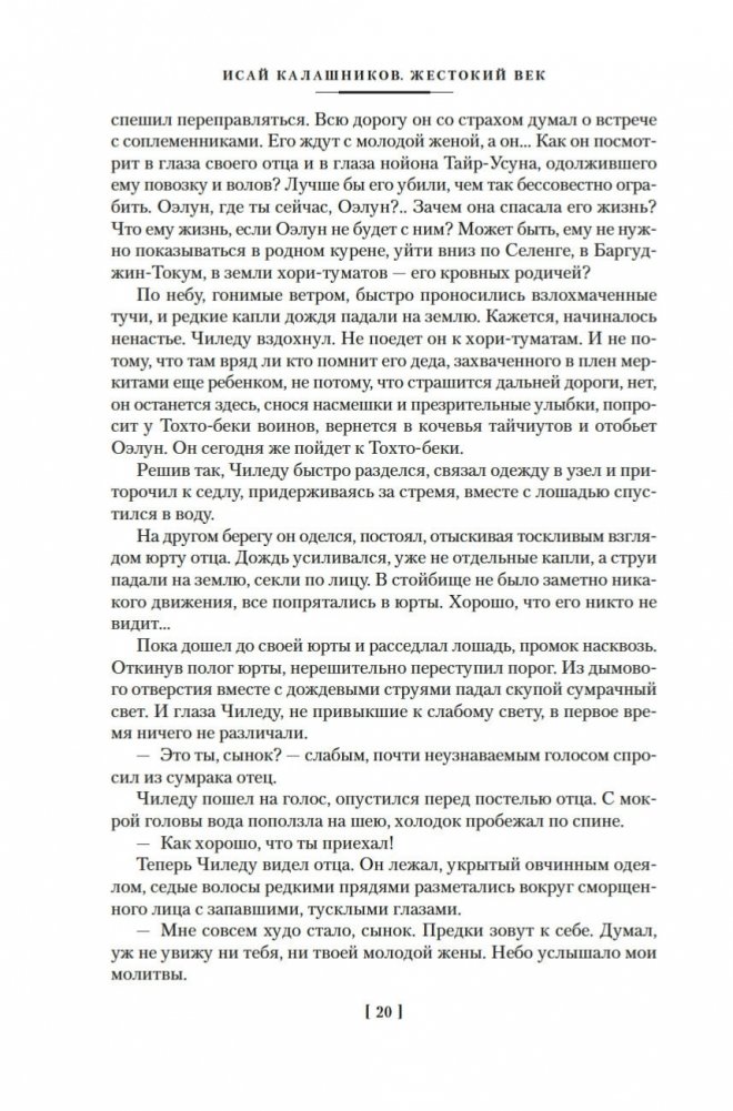 Монументальный исторический эпос Исая Калашникова «Жестокий век» вышел в свет в 1978 году и сразу же получил признание как один из выдающихся образцов жанра. С тех пор он с неизменным успехом переиздавался несколько раз, и хотя многое было написано за эти годы о легендарных событиях того дальнего времени, произведение Калашникова по-прежнему не перестает восхищать читателей глубиной и мастерством проработки исторического материала, положенного в основу этого грандиозного и захватывающего романа. В бескрайней монгольской степи в середине XII века в знатном роду тайджиут появился на свет мальчик, имени которого суждено было железом и кровью запечатлеться в истории человечества. Рано потеряв отца, Тэмуджин преодолел множество невзгод и обрел беспримерное могущество и беспримерную славу под именем Чингисхан. Как предводитель войска, подобно неудержимой лавине сметающего все на своем пути, как правитель, в своей безудержной жажде власти стремящийся обрести власть над всем миром.