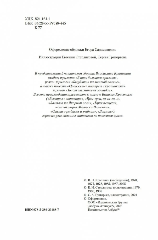 Во вселенной Владислава Крапивина чудо и фантастика действуют на равных правах. Космические суперкрейсеры дальней разведки соседствуют здесь с мальчишками, летающими над миром, как ветерки, ведьмы уживаются с роботами, а школьники выбирают себе в друзья очень умного мальчика-роботенка. Сама вселенная у Крапивина не просто необозримое пространство со звездными галактиками-морями и планетами-островами в них — это необъятный кристалл, число граней которого бесконечно и на каждой грани свой мир, похожий на соседний и непохожий. На одной грани это Земля, на которой живем мы с вами. На соседней грани — планета, практически от нашей неотличимая, только все здесь вывернуто наизнанку. Потому что те, кто велит, — твари непонятной природы, не имеющие даже собственной оболочки, а вселяющиеся в манекены и статуи, — подчинили ее себе ради некой безумной цели. «Когда люди становятся равнодушными, ленивыми или слишком сытыми, когда им наплевать на свою планету, появляются те, кто велит. И кое-кто из людей не против: так спокойнее и проще…» — говорит в романе «Голубятня на желтой поляне» один из героев. И похоже, эта простая истина еще долго не потеряет смысла ни в мире-близнеце из романа, ни в нашем мире. Цикл о Великом Кристалле в творчестве Владислава Крапивина занимает особое место. Произведения, вошедшие в цикл, написанные в разное время, но связанные единой мыслью, — это не просто проза, это философия подвига. Это философия жизни, такой, какой она обязана быть. Фантастической, и никак иначе.