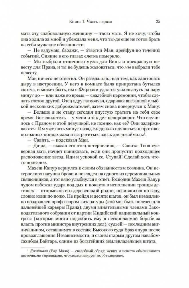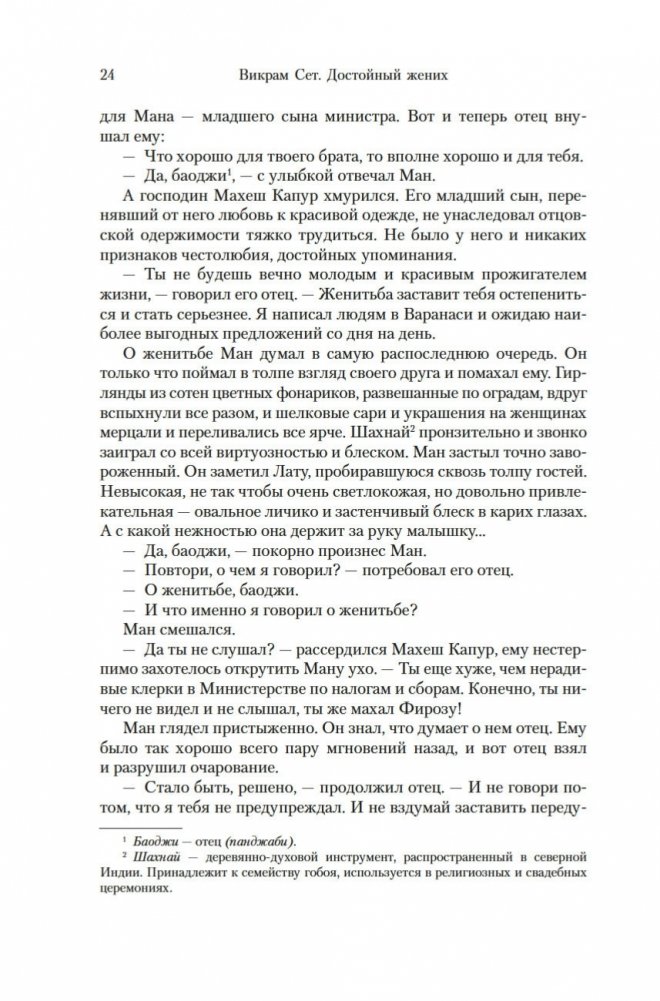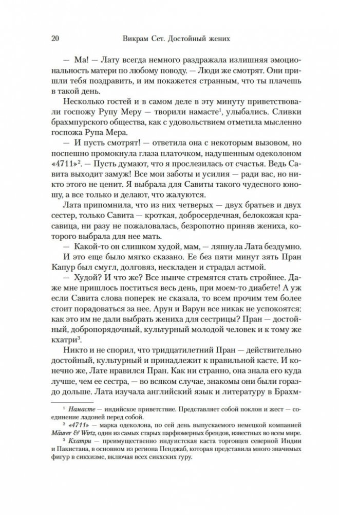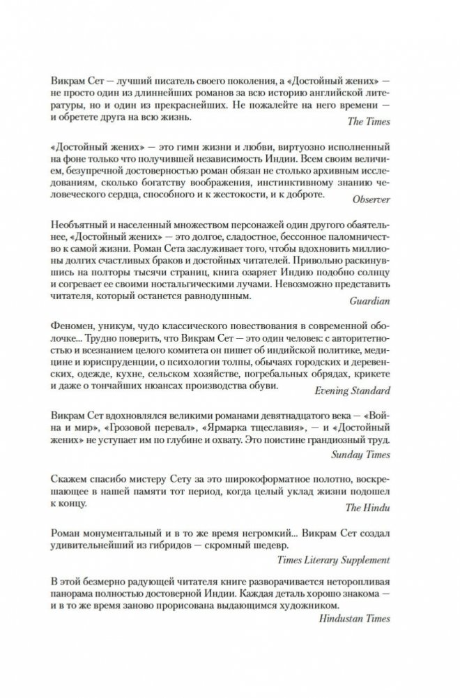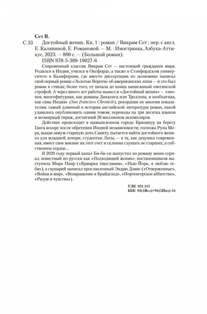 Современный классик Викрам Сет — настоящий гражданин мира. Родился в Индии, учился в Оксфорде, а также в Стэнфордском университете в Калифорнии, где вместо диссертации по экономике написал свой первый роман «Золотые Ворота» об американских яппи — и это был роман в стихах; более того, от начала до конца написанный онегинской строфой. А через много лет работы вышел и «Достойный жених» — «эпопея, многофигурная, как романы Диккенса или Троллопа, и необъятная, как сама Индия» (San Francisco Chronicle), рекордная по многим показателям: самый длинный в истории английской литературы роман, какой удавалось опубликовать одним томом; переводы на три десятка языков и всемирный тираж, достигший 26 миллионов экземпляров. Действие происходит в вымышленном городе Брахмпур на берегу Ганга вскоре после обретения Индией независимости; госпожа Рупа Мера, выдав замуж старшую дочь Савиту, пытается найти достойного жениха для младшей дочери, студентки Латы, — а та, как девушка современная, имеет свое мнение на этот счет и склонна слушать не старших, а собственное сердце... В 2020 году первый канал Би-би-си выпустил по роману мини-сериал, известный по-русски как «Подходящий жених»; постановщиком выступила Мира Наир («Ярмарка тщеславия», «Нью-Йорк, я люблю тебя»), а сценарий написал прославленный Эндрю Дэвис («Отверженные», «Война и мир», «Возвращение в Брайдсхед», «Нортенгерское аббатство», «Разум и чувства»).
