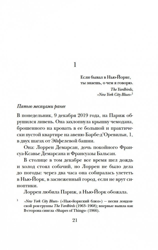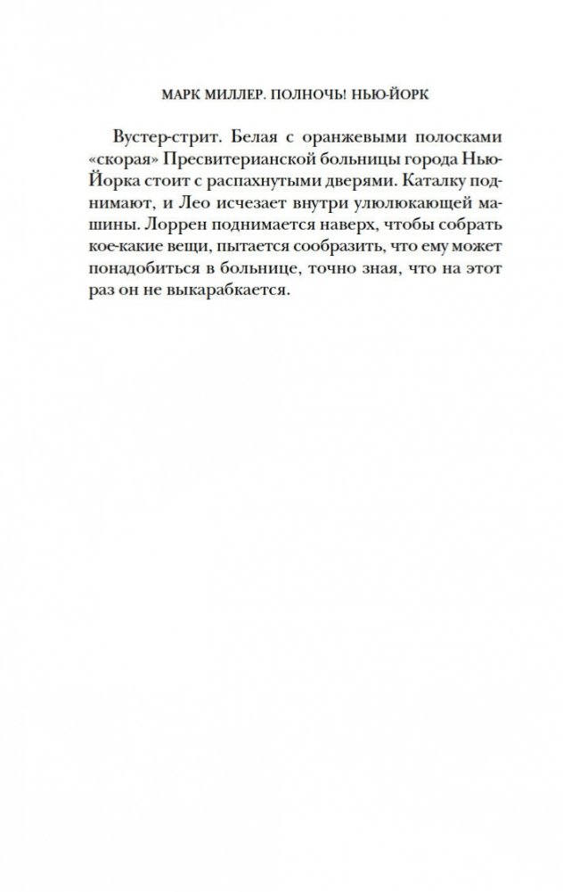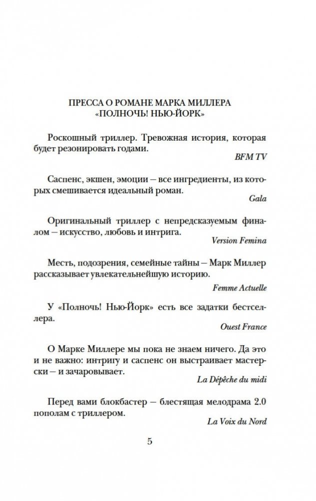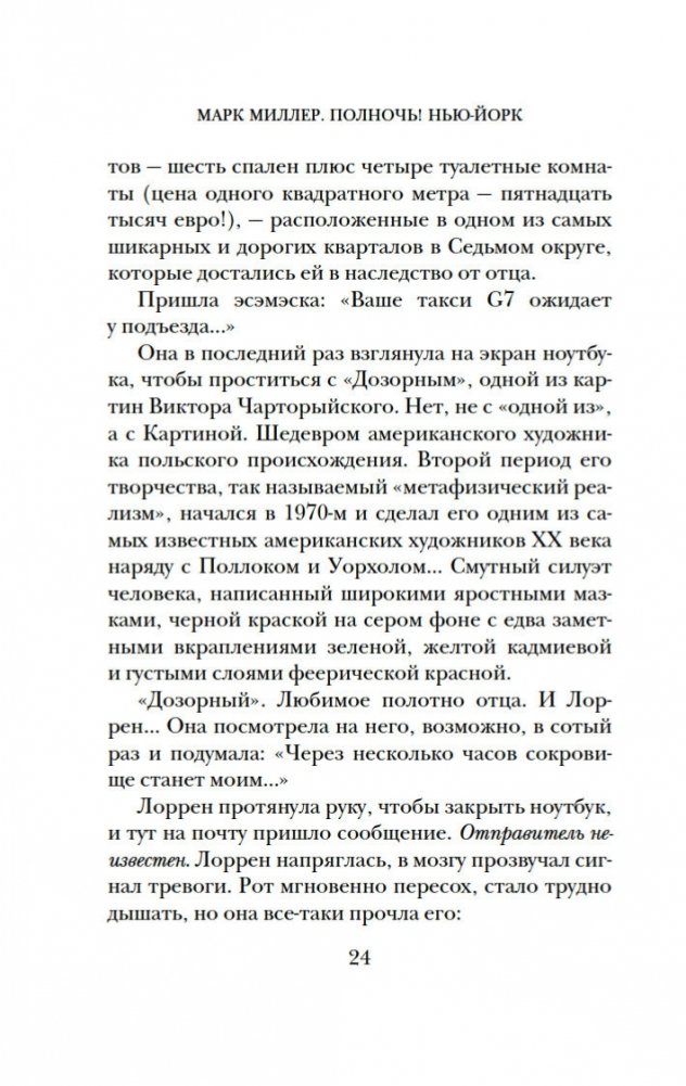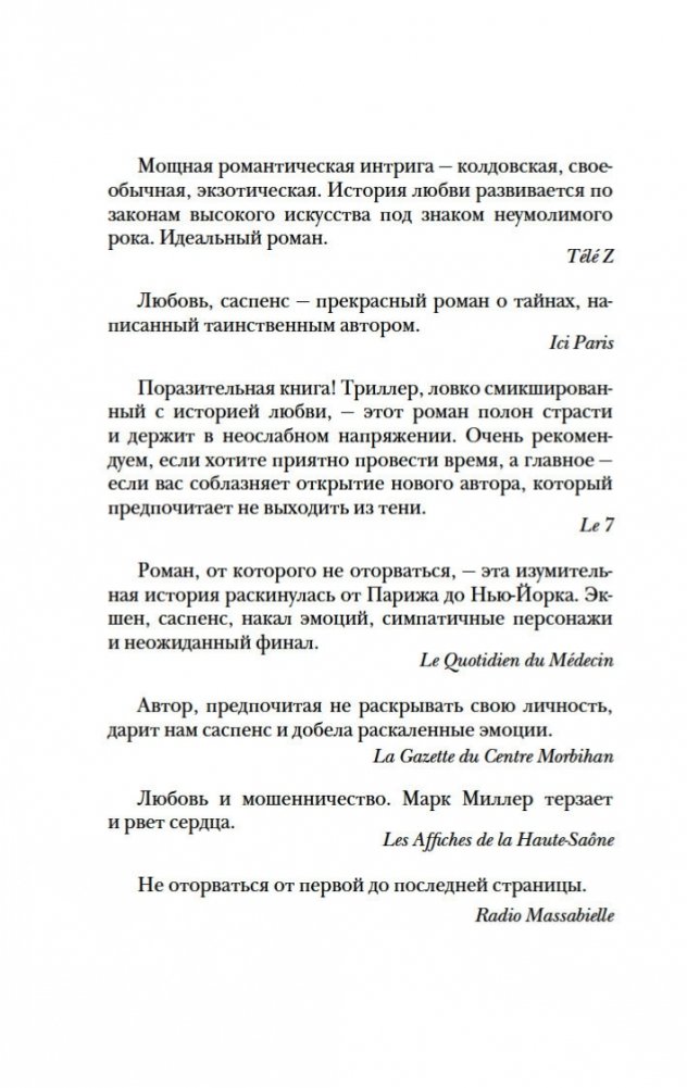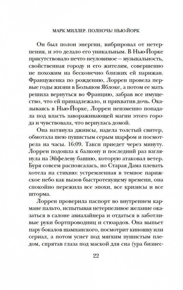 Однажды издателю Бернару Фиксо позвонил незнакомец, француз из Нью-Йорка, — пообещал прислать любопытный роман и бросил трубку. Вскоре под дверью у Фиксо возник пакет с рукописью. Подобные фокусы редко производят впечатление на опытных издателей, но из любопытства Фиксо эту рукопись прочел — и восхитился, и тотчас ее напечатал. Так состоялся громкий дебют Марка Миллера, самого таинственного французского автора, написавшего эту захватывающую историю. Париж. Лоррен, сотрудница пиар-агентства, тонкая ценительница искусства, едет в Нью-Йорк, где ей предстоит повышение. Неизвестный человек, якобы много лет назад убивший ее отца, шлет ей письма с угрозами, ее жизнь в опасности, но это обстоятельство Лоррен от всех скрывает. Нью-Йорк. Лео, талантливый художник, выходит из тюрьмы, где просидел три года за подделку картин великих мастеров. Покупатели подделок недовольны, и на свободе Лео предстоят крупные неприятности. Конечно, эти двое встретятся. Конечно, им предстоят великие испытания и великая любовь. И конечно, их общая история превратится в головокружительное приключение, потому что их жизни переплелись много лет назад, хотя оба они об этом не подозревают, а угрозы преследователя отнюдь не пусты. Марк Миллер написал романтичную и напряженную историю, в которой смешались любовь, искусство, алчность, тайны происхождения и непредсказуемость судеб. Что еще нужно для увлекательного романа? Знать, кто его написал, — но имя автора окутано тайной. Марк Миллер тщательно оберегает свое инкогнито, и критики, превознося его дебют «Полночь! Нью-Йорк», относительно личности автора теряются в догадках вместе с читателями. Перед вами, таким образом, двойная интрига: история Лео и Лоррен и история автора — и одну из этих историй вы дочитаете до финала на одном дыхании.