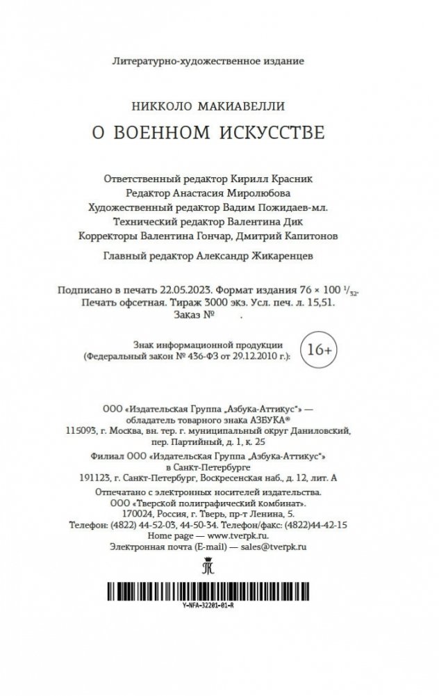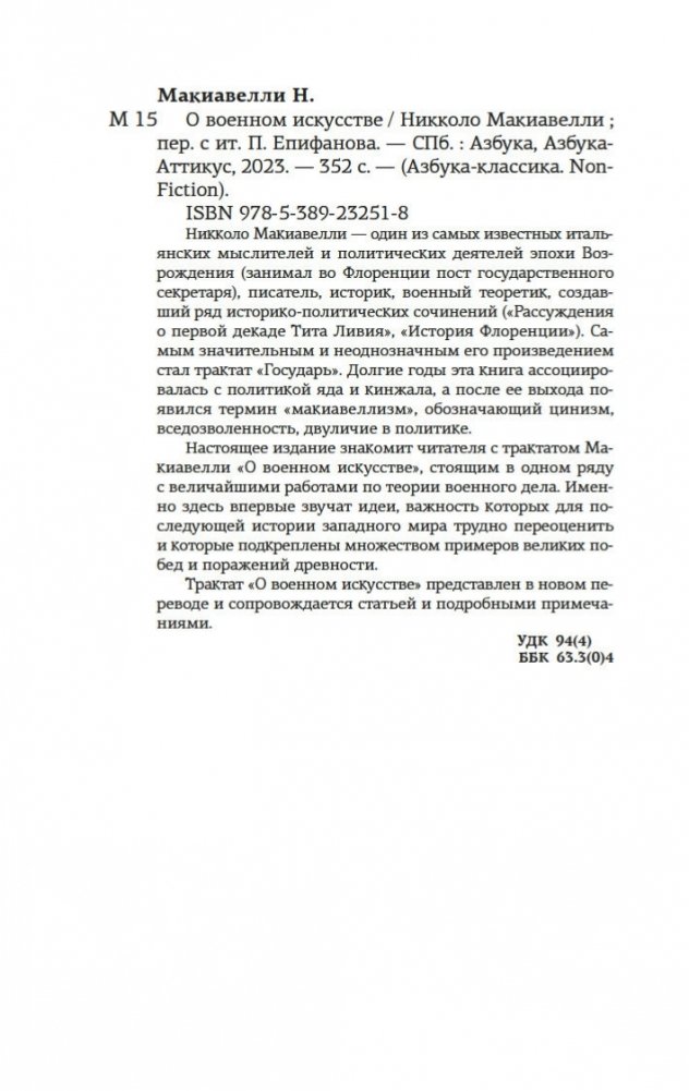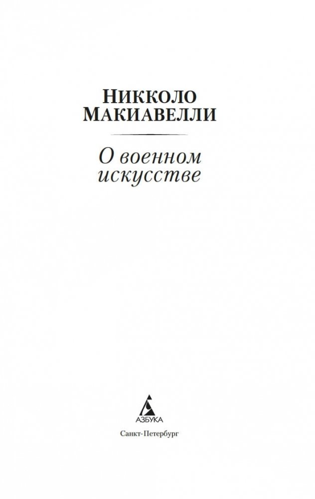 Никколо Макиавелли — один из самых известных итальянских мыслителей и политических деятелей эпохи Возрождения (занимал во Флоренции пост государственного секретаря), писатель, историк, военный теоретик, создавший ряд историко-политических сочинений («Рассуждения о первой декаде Тита Ливия», «История Флоренции»). Самым значительным и неоднозначным его произведением стал трактат «Государь». Долгие годы эта книга ассоциировалась с политикой яда и кинжала, а после ее выхода появился термин «макиавеллизм», обозначающий цинизм, вседозволенность, двуличие в политике. Настоящее издание знакомит читателя с трактатом Макиавелли «О военном искусстве», стоящим в одном ряду с величайшими работами по теории военного дела. Именно здесь впервые звучат идеи, важность которых для последующей истории западного мира трудно переоценить и которые подкреплены множеством примеров великих побед и поражений древности. Трактат «О военном искусстве» представлен в новом переводе и сопровождается статьей и подробными примечаниями.