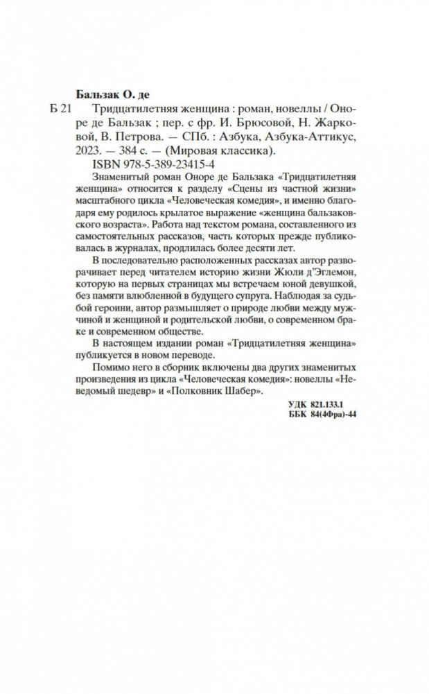 Знаменитый роман Оноре де Бальзака «Тридцатилетняя женщина» относится к разделу «Сцены из частной жизни» масштабного цикла «Человеческая комедия», и именно благодаря ему родилось крылатое выражение «женщина бальзаковского возраста». Работа над текстом романа, составленного из самостоятельных рассказов, часть которых прежде публиковалась в журналах, продлилась более десяти лет. В последовательно расположенных рассказах автор разворачивает перед читателем историю жизни Жюли д’Эглемон, которую на первых страницах мы встречаем юной девушкой, без памяти влюбленной в будущего супруга. Наблюдая за судьбой героини, автор размышляет о природе любви между мужчиной и женщиной и родительской любви, о современном браке и современном обществе. В настоящем издании роман «Тридцатилетняя женщина» публикуется в новом переводе. Помимо него в сборник включены два других знаменитых произведения из цикла «Человеческая комедия»: новеллы «Неведомый шедевр» и «Полковник Шабер».