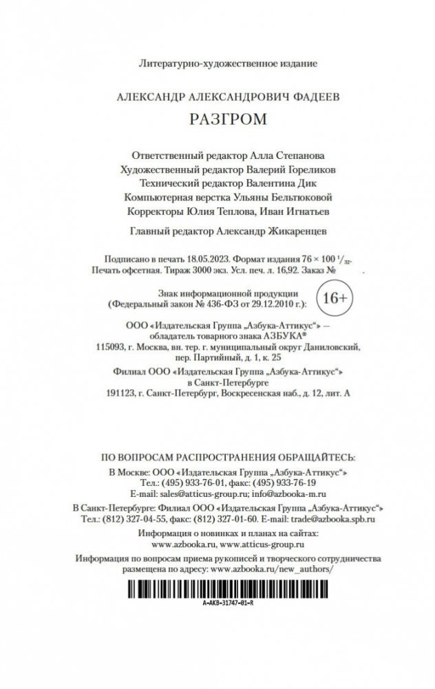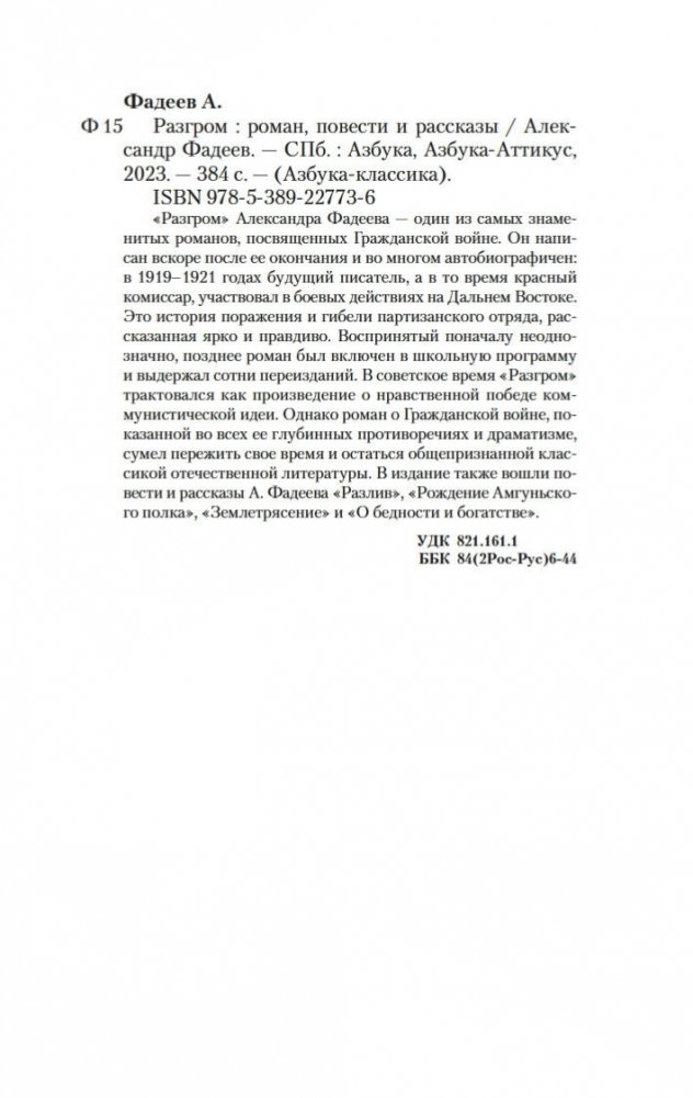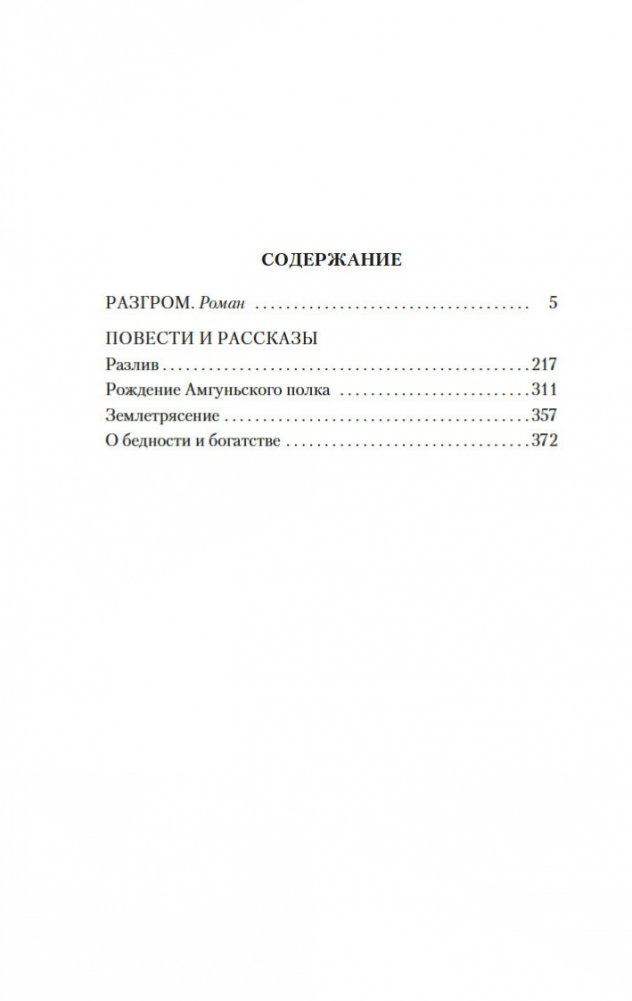 «Разгром» Александра Фадеева — один из самых знаменитых романов, посвященных Гражданской войне. Он написан вскоре после ее окончания и во многом автобиографичен: в 1919–1921 годах будущий писатель, а в то время красный комиссар, участвовал в боевых действиях на Дальнем Востоке. Это история поражения и гибели партизанского отряда, рассказанная ярко и правдиво. Воспринятый поначалу неоднозначно, позднее роман был включен в школьную программу и выдержал сотни переизданий. В советское время «Разгром» трактовался как произведение о нравственной победе коммунистической идеи. Однако роман о Гражданской войне, показанной во всех ее глубинных противоречиях и драматизме, сумел пережить свое время и остаться общепризнанной классикой отечественной литературы. В издание также вошли повести и рассказы А. Фадеева «Разлив», «Рождение Амгуньского полка», «Землетрясение» и «О бедности и богатстве».