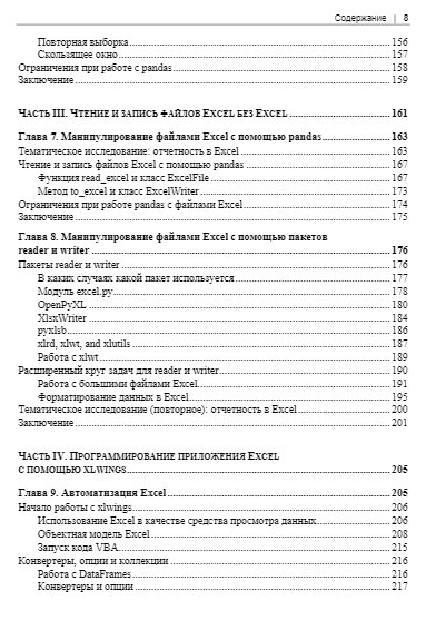 Книга посвящена автоматизации Excel с помощью языка программирования Python. Описаны дистрибутив Anaconda Python и современные средства разработки, такие как менеджеры пакетов Conda и pip, блокноты Jupyter и Visual Studio Code. Даны необходимые основы языка Python и введение в анализ данных с помощью библиотеки pandas. Приведены приемы чтения и записи файлов Excel без Excel. Рассмотрено программирование приложений Excel с помощью популярного пакета с открытым исходным кодом xlwings: автоматизация Excel, инструменты на основе технологии Python, трекер пакетов Python, а также функции, определяемые пользователем.
