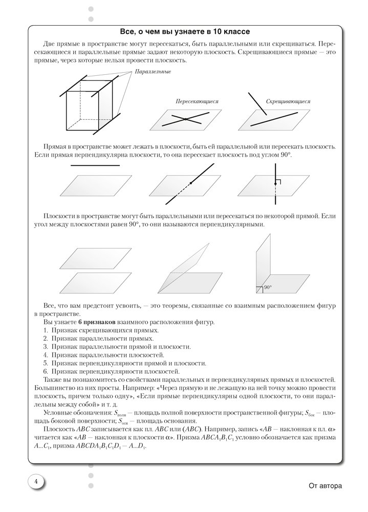 Книга дополняет действующие учебные пособия для 10 класса. Она позволяет быстро обобщить, систематизировать учебный материал и при желании изучить его с опережением программы. Каждая глава сопровождается опорным конспектом с контрольными вопросами, ответами на них и набором задач на готовых чертежах, имеющих параллельную двухвариантную структуру. В конце издания ко всем задачам приводятся ответы.