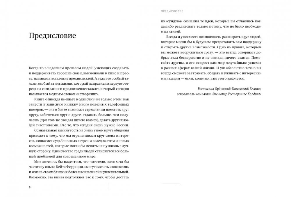 Простые и действенные уроки правильного нетворкинга от Кейта Феррацци, обладателя "одной из широчайших сетей контактов в мире". Связи решают все. Уже давно в Европе и Америке одним из главных навыков, в частности для предпринимателя и менеджера, считается нетворкинг — умение открыто и искренне общаться с самыми разными людьми, выстраивая сеть полезных знакомств. Люди, которые создают прочную сеть взаимоотношений, всегда добиваются успеха в бизнесе. Причина проста: если вас знают и хорошо к вам относятся, с вами охотнее будут сотрудничать. Кейт Феррацци, обладатель "одной из широчайших сетей контактов в мире" по версии Forbes, делится простыми и действенными правилами нетворкинга. Он раскрывает секреты построения широкой сети взаимовыгодных связей в бизнесе и не только. И учит устанавливать глубокие и прочные человеческие связи, благодаря которым вы сможете значительно укрепить свой бизнес, найти новых клиентов и партнеров, а еще — наставников и друзей, всегда готовых поддержать и помочь претворить в жизнь ваши планы. Следуя советам из книги, вы не только реализуете свои амбиции и способности и поможете кому-то сделать то же самое, но и, несомненно, украсите свою жизнь общением с интересными собеседниками. Почему мы решили издать эту книгу: Книга Кейта Феррацци стала бестселлером The New York Times и Forbes. Ее популярность убедила нас: опыт автора необходим каждому, кто проникся идеей нетворкинга. Фишки книги: В записной книжке автора более пяти тысяч контактов, да каких! Вы видели их по ТВ и читали о них в газетах. Это хорошие знакомые, к которым Кейт может обратиться за помощью. Stanford Business School использует идеи Кейта в обучении своих студентов, они также включены в программы MBA по всему миру. К написанию книги привела статья Тала Рэза The 10 Secrets of a Master Networker. Гуру менеджмента Том Питерс назвал эту книгу одной из самых необычных и ценных бизнес-книг новейшей истории. Для кого книга: Книга обязательна для предпринимателей и руководителей и рекомендуется всем, кто хочет преуспеть.