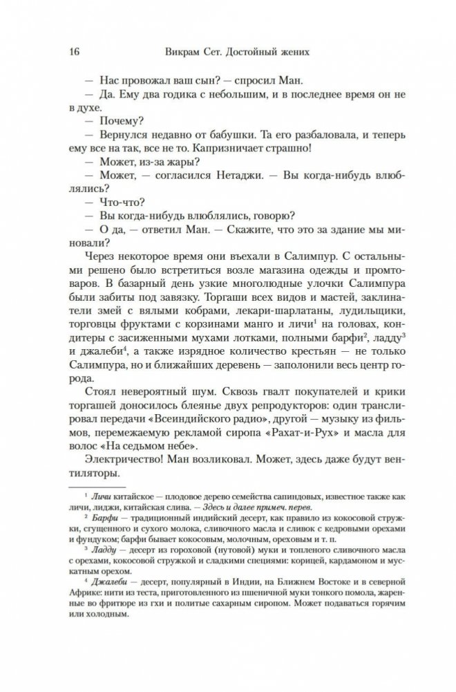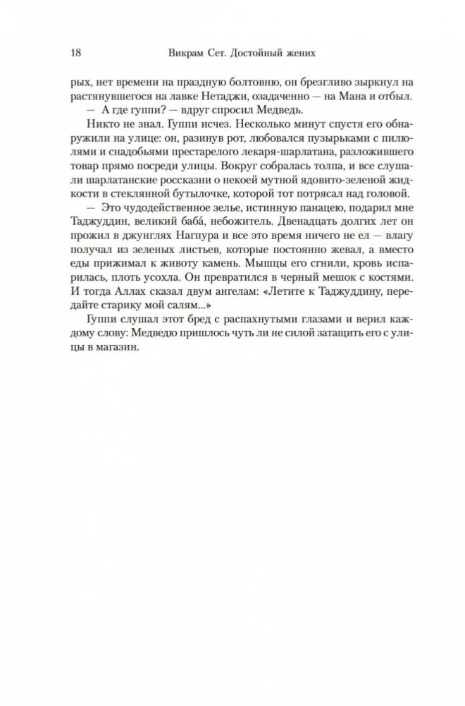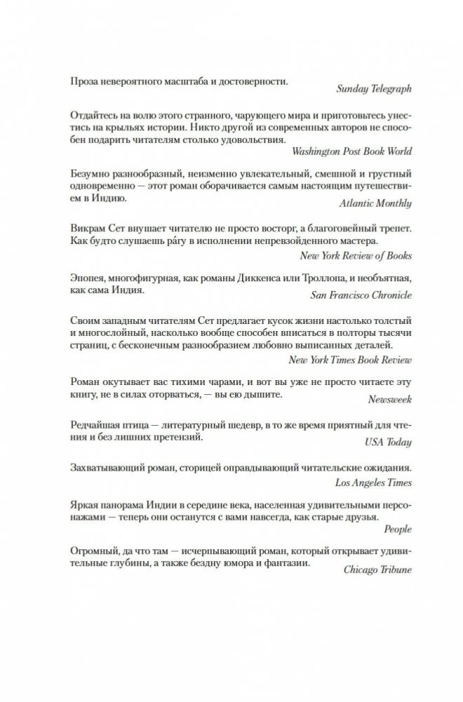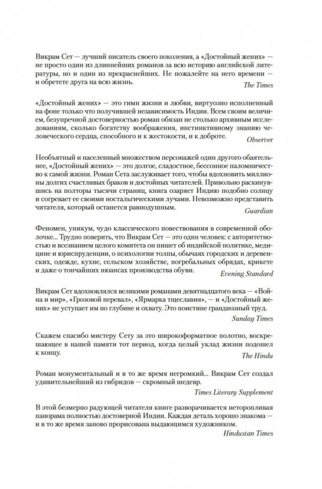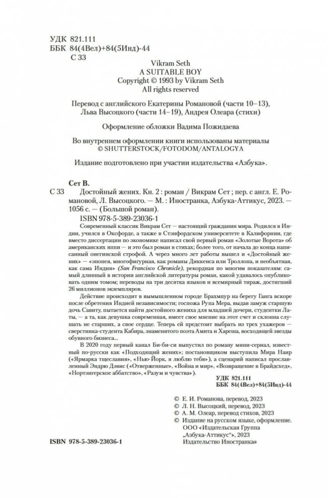 Современный классик Викрам Сет — настоящий гражданин мира. Родился в Индии, учился в Оксфорде, а также в Стэнфордском университете в Калифорнии, где вместо диссертации по экономике написал свой первый роман «Золотые Ворота» об американских яппи — и это был роман в стихах; более того, от начала до конца написанный онегинской строфой. А через много лет работы вышел и «Достойный жених» — «эпопея, многофигурная, как романы Диккенса или Троллопа, и необъятная, как сама Индия» (San Francisco Chronicle), рекордная по многим показателям: самый длинный в истории английской литературы роман, какой удавалось опубликовать одним томом; переводы на три десятка языков и всемирный тираж, достигший 26 миллионов экземпляров. Действие происходит в вымышленном городе Брахмпур на берегу Ганга вскоре после обретения Индией независимости; госпожа Рупа Мера, выдав замуж старшую дочь Савиту, пытается найти достойного жениха для младшей дочери, студентки Латы, — а та, как девушка современная, имеет свое мнение на этот счет и склонна слушать не старших, а свое сердце. Теперь ей предстоит выбрать из трех ухажеров — сверстника-студента Кабира, знаменитого поэта Амита и Хареша, восходящей звезды обувного бизнеса... В 2020 году первый канал Би-би-си выпустил по роману мини-сериал, известный по-русски как «Подходящий жених»; постановщиком выступила Мира Наир («Ярмарка тщеславия», «Нью-Йорк, я люблю тебя»), а сценарий написал прославленный Эндрю Дэвис («Отверженные», «Война и мир», «Возвращение в Брайдсхед», «Нортэнгерское аббатство», «Разум и чувства»).