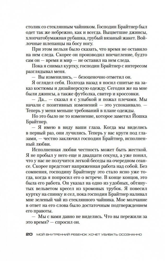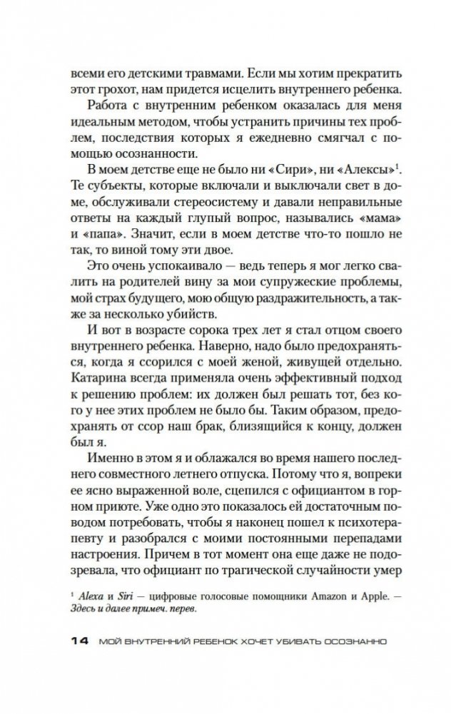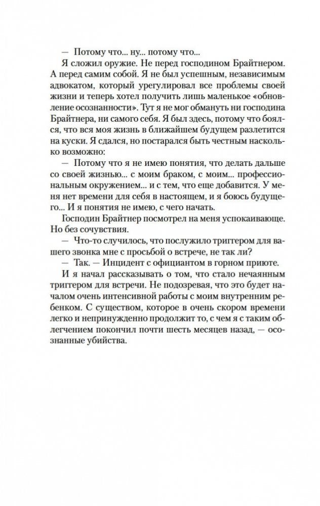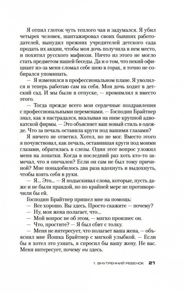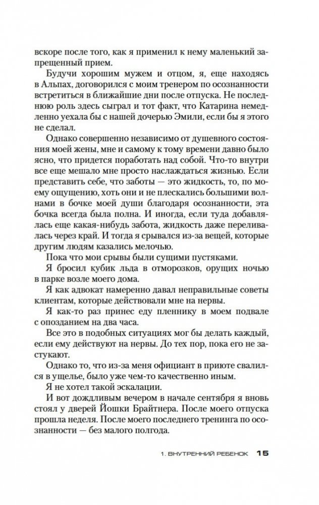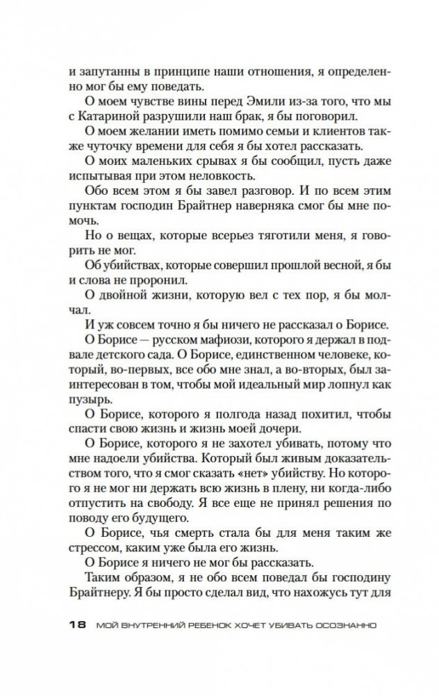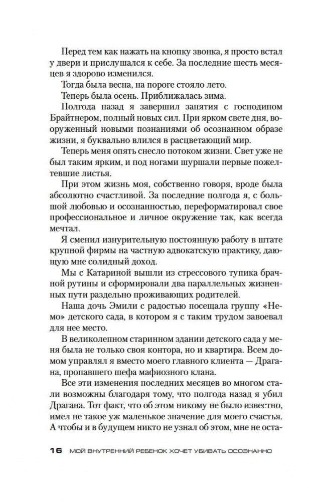 Долгожданное продолжение мирового бестселлера «Убивать осознанно»! Жизнь главного героя Бьорна Димеля изменилась к лучшему. Он уже не «грязный адвокатишка» на побегушках у мафии, но уважаемый бизнесмен и владелец детского сада. С помощью техники осознанности ему удалось выбраться «из стрессового тупика брачной рутины» и обрести видимость внутренней гармонии. Однако можно ли назвать Бьорна Димеля по-настоящему счастливым человеком? Он продолжает испытывать стресс, он продолжает бояться будущего, он продолжает… убивать. Проблемы с законом, с мафией, с личной жизнью вновь обступают его со всех сторон, заставляя еще раз обратиться за помощью к знаменитому Йошке Брайтнеру, специалисту по осознанности. И здесь Бьорн Димель наконец узнает, что между ним и полноценной счастливой жизнью стоит внутренний ребенок, со своими детскими травмами, неисполненными желаниями и капризами. Внутренний ребенок, который хочет любви и понимания и ради их достижения не остановится ни перед чем...