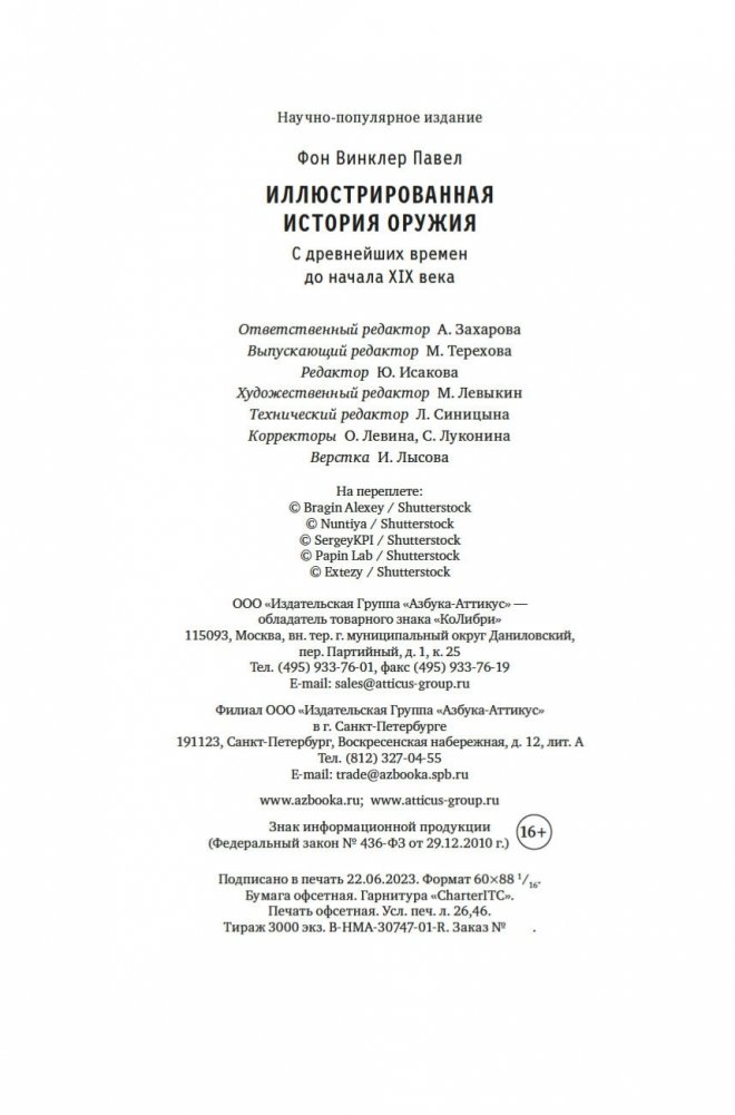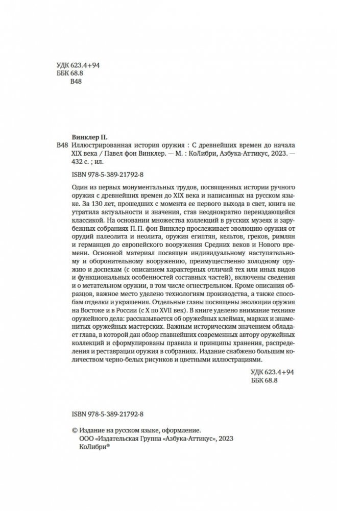 Один из первых монументальных трудов, посвященных истории ручного оружия с древнейших времен до XIX века и написанных на русском языке. За 130 лет, прошедших с момента ее первого выхода в свет, книга не утратила актуальности и значения, став неоднократно переиздающейся классикой. На основании множества коллекций в русских музеях и зарубежных собраниях П. П. фон Винклер прослеживает эволюцию оружия от орудий палеолита и неолита, оружия египтян, кельтов, греков, римлян и германцев до европейского вооружения Средних веков и Нового времени. Основной материал посвящен индивидуальному наступательному и оборонительному вооружению, преимущественно холодному оружию и доспехам (с описанием характерных отличий тех или иных видов и функциональных особенностей составных частей), включены сведения и о метательном оружии, в том числе огнестрельном. Кроме описания образцов, важное место уделено технологиям производства, а также способам отделки и украшения. Отдельные главы посвящены эволюции оружия на Востоке и в России (с X по XVII век). В книге уделено внимание технике оружейного дела: рассказывается об оружейных клеймах, марках и знаменитых оружейных мастерских. Важным историческим значением обладает глава, в которой дан обзор главнейших современных автору оружейных коллекций и сформулированы правила и принципы хранения, распределения и реставрации оружия в собраниях. Издание снабжено большим количеством черно-белых рисунков и цветными иллюстрациями.