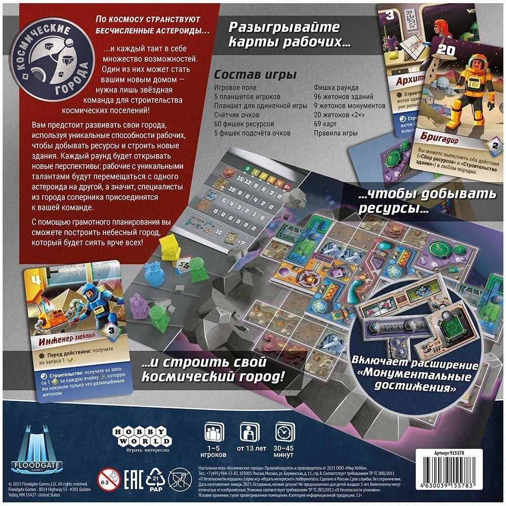 В настольной игре "Космические города" вам предстоит развивать свои города на безжизненных астероидах. В этом вам помогут рабочие, как же без них? Каждый рабочий обладает уникальными способностями, которые будут помогать вам добывать необходимые ресурсы и возводить здания. Поскольку вы строите города на астероидах, рабочие каждый раунд будут перелетать от одного города к другому: таким образом специалисты, которые помогали вашим оппонентам, присоединяться к вашей команде. Грамотно планируйте свои ходы, чтобы ваш город засиял ярче звёзд!