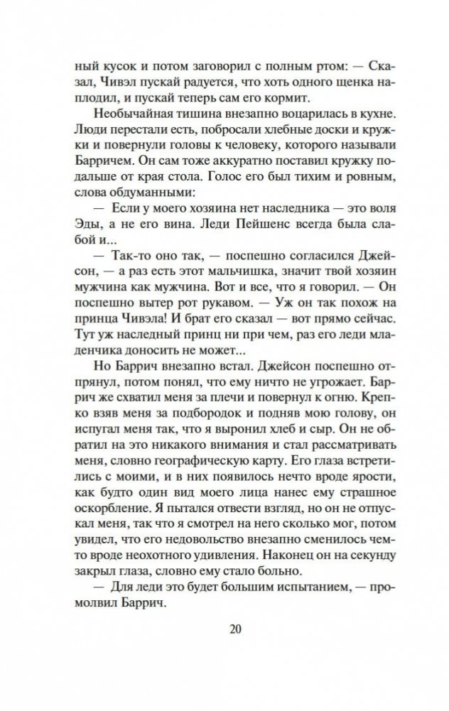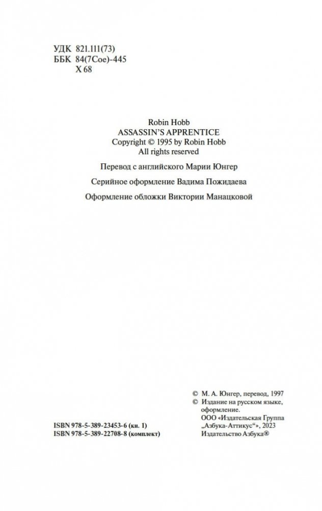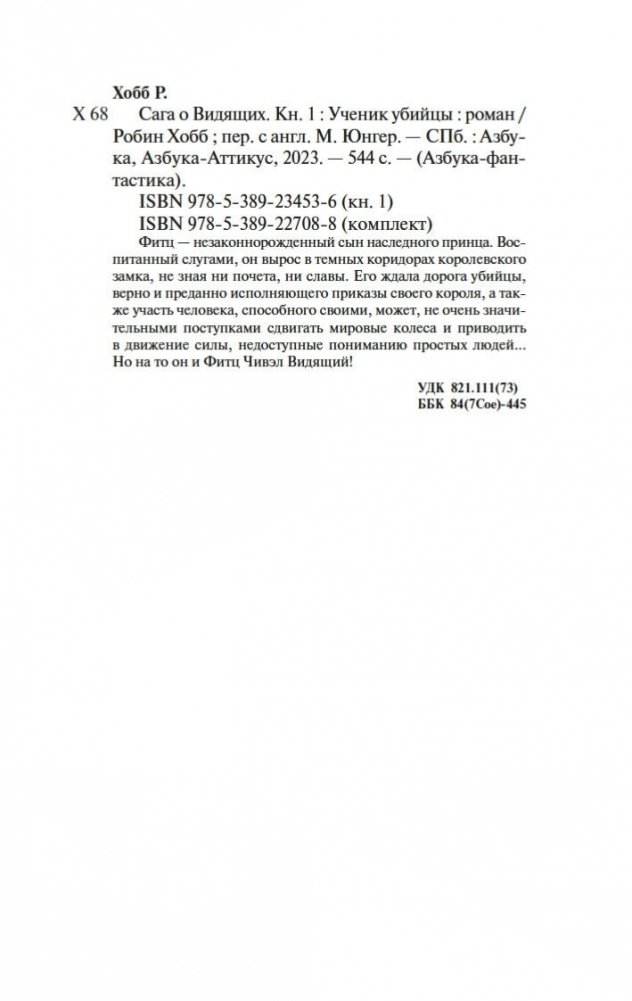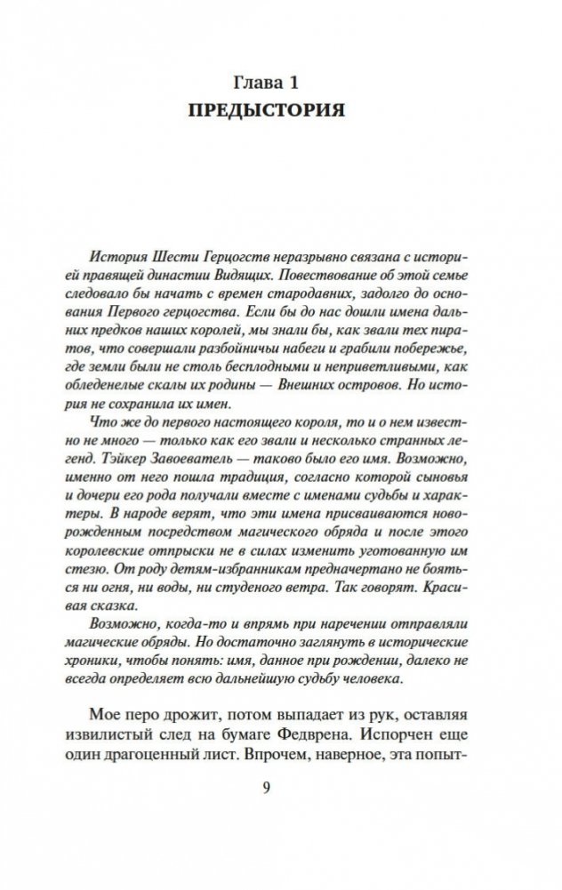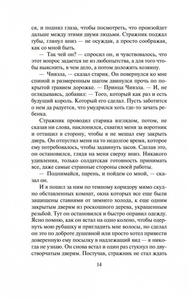 Фитц — незаконнорожденный сын наследного принца. Воспитанный слугами, он вырос в темных коридорах королевского замка, не зная ни почета, ни славы. Его ждала дорога убийцы, верно и преданно исполняющего приказы своего короля, а также участь человека, способного своими, может, не очень значительными поступками сдвигать мировые колеса и приводить в движение силы, недоступные пониманию простых людей... Но на то он и Фитц Чивэл Видящий!