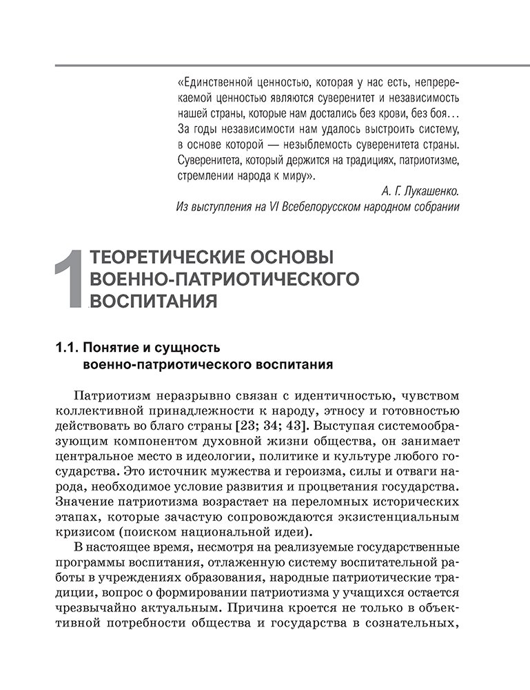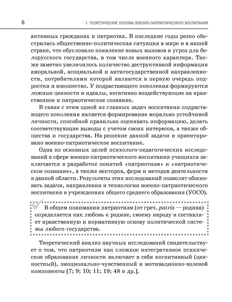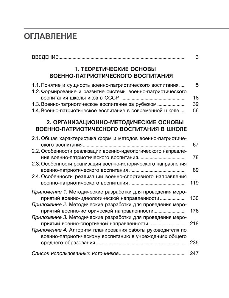 В пособии отражены теоретические и практические аспекты организации работы по военно-патриотическому воспитанию учащихся. Рассматриваются основные направления, формы и методы военно-патриотического воспитания, а также особенности реализации военно-идеологического, военно-исторического и военно-спортивного направлений на I, II и III ступенях общего среднего образования. Предлагается алгоритм составления календарного плана работы по военно-патриотическому воспитанию в учреждениях общего среднего образования.
