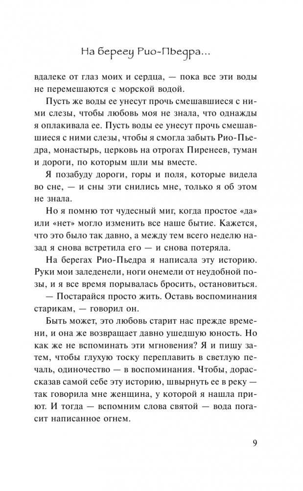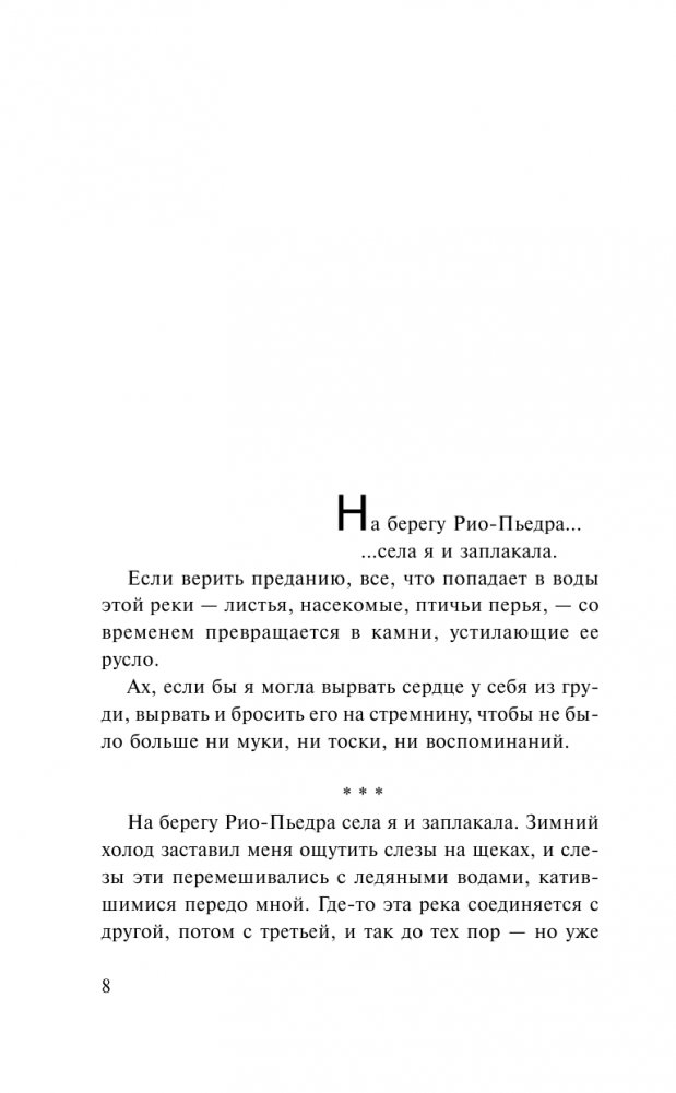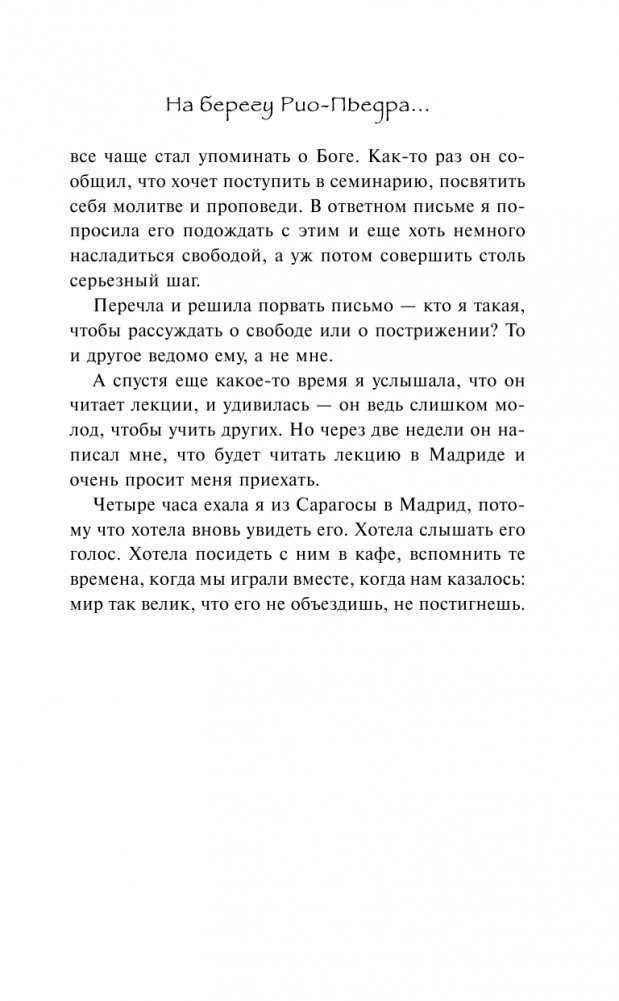 Что бывает с юной любовью, когда робость не позволяет ей раскрыться? И что бывает, когда годы спустя судьба вновь соединяет влюбленных? Ведь жизнь уже научила ее быть сильной и скрывать свои чувства, а он стал духовным наставником и даже, говорят, способен творить чудеса. Новая встреча становится для них началом нового пути. И первые шаги они сделают вместе – на берегу реки Рио-Пьедра, в маленькой деревушке во Французских Пиренеях, где они находят нужные слова и учатся ценить друг друга.