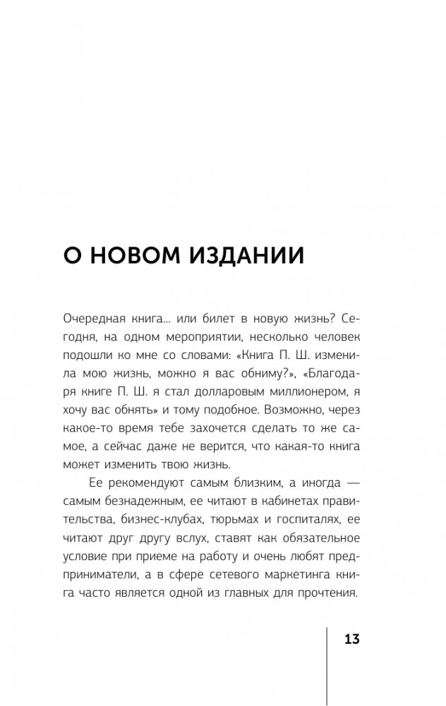 «Хочу предупредить, что „П. Ш.“ — книга, меняющая твой мир. Твоя жизнь после ее прочтения больше не будет прежней. Подумай, стоит ли переворачивать страницу, которая перевернет твой мир? Может, лучше все оставить как есть? Просто обратного пути не будет. Впереди — путь, конечная цель которого зависит от твоего решения, но, приняв его, придется брать ответственность за все происходящее только на себя. Готов ли ты к этому?»