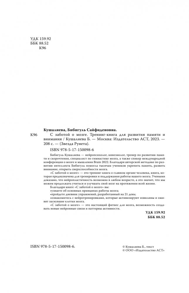 Бибигуль Кушалиева — нейропсихолог, кинезиолог, тренер по развитию памяти и скорочтения, специалист по гимнастике мозга, а также спикер международной конференции о мозге и мышлении Brain 2022. Благодаря авторской методике по развитию интеллекта Бибигуль помогла тысячам учеников укрепить память, развить внимание, открыть сверхспособности мозга.