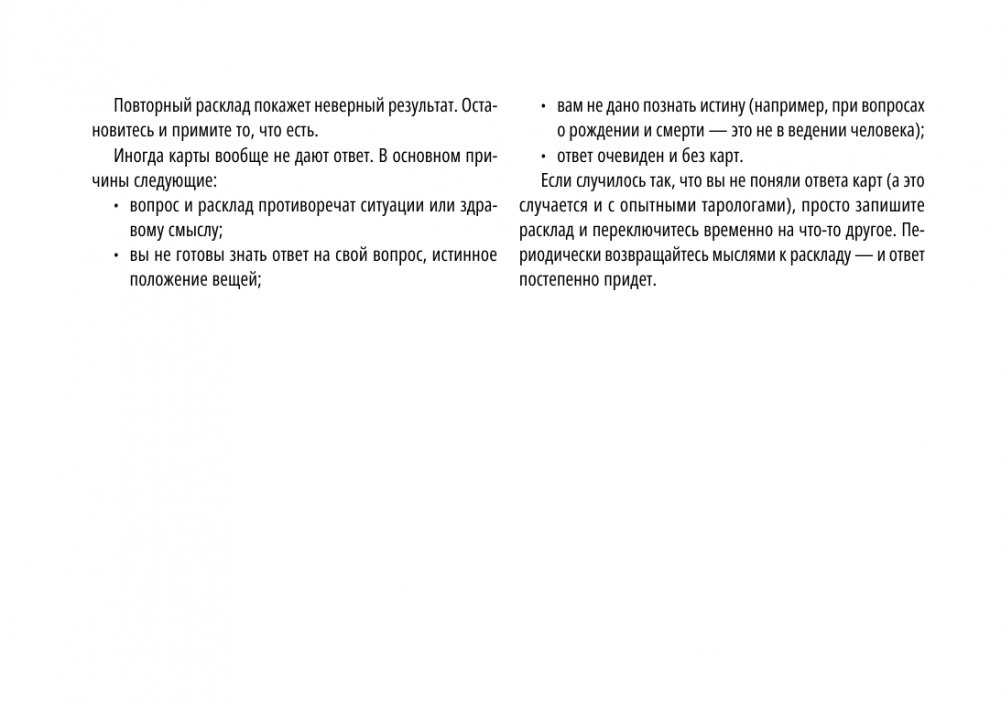 К колоде приложены 30 раскладов от самых простых (да/нет) до больших и сложных (расклад на год).