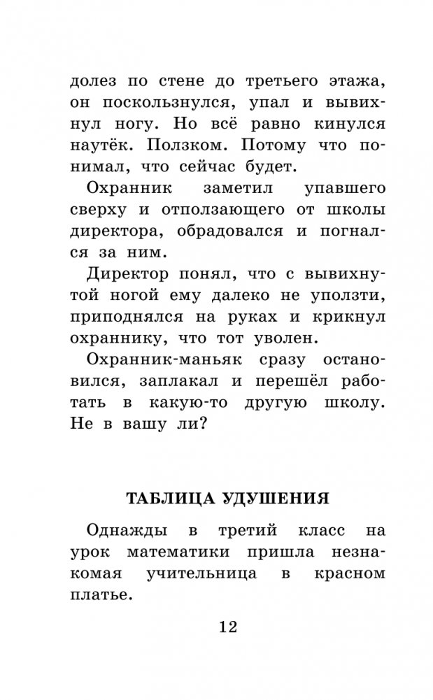 В книгу вошли два произведения Григория Остера: "Робинзон и 13 жадностей" и "Школа ужасов". Повесть "Робинзон и 13 жадностей" — о том, как дружно и весело жилось на острове людям, нашедшим пиратские клады. До тех пор, пока пираты не вернулись за своими сокровищами. И какую страшную месть придумали морские разбойники, чтобы наказать тех, кто их ограбил. А спасла всех одна не очень взрослая девочка, которая в тот момент работала Президентом. "Школа ужасов" — это очень страшные и очень смешные истории про тайны школьной жизни: танцующий скелет из кабинета анатомии, козла из физкультурного зала, призрак уборщицы и кровожадную тряпку.