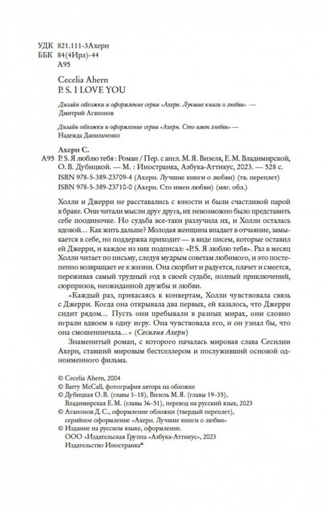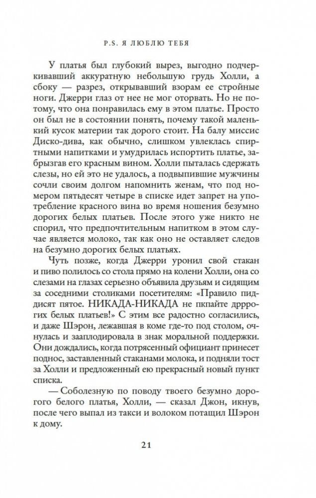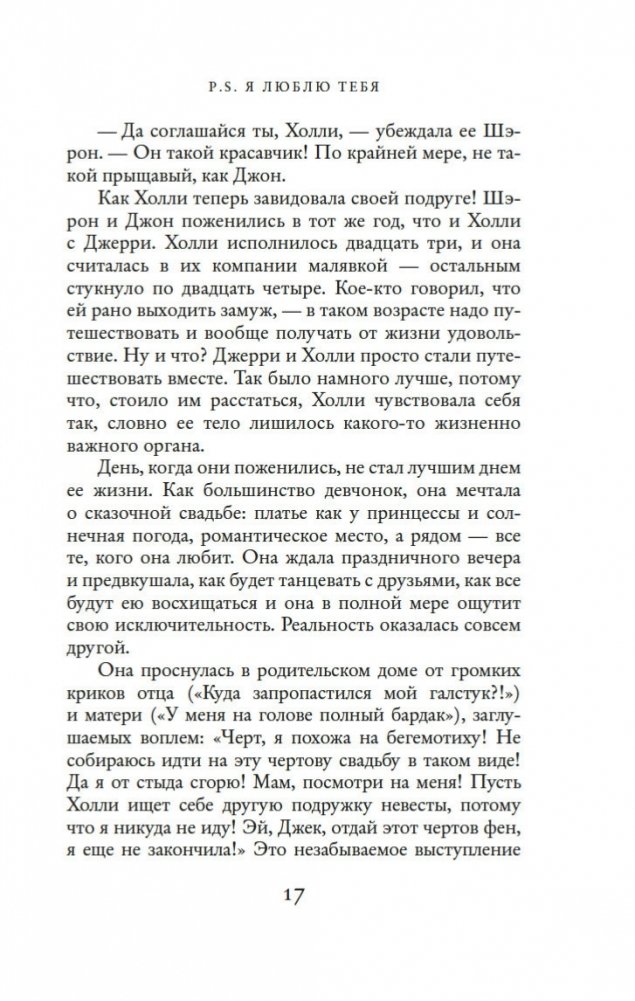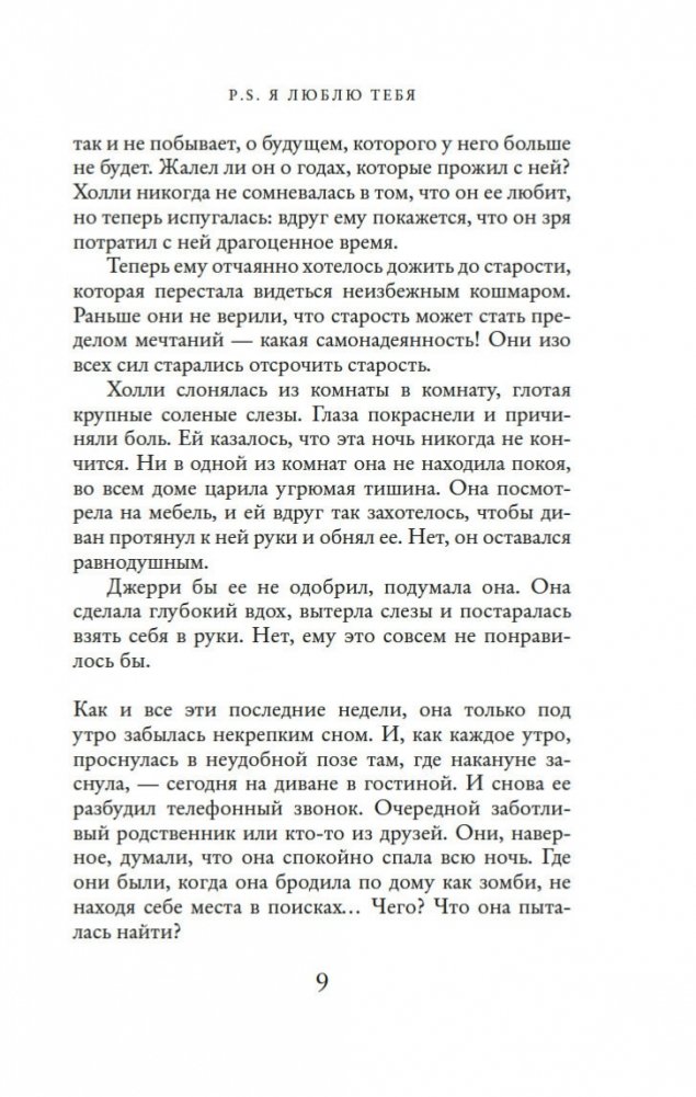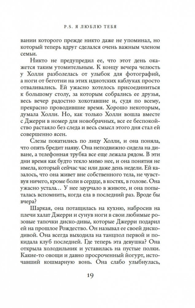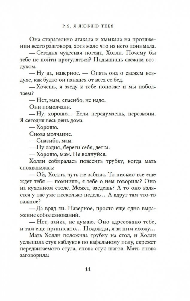 Холли и Джерри не расставались с юности и были счастливой парой в браке. Они читали мысли друг друга, их невозможно было представить себе по-одиночке. Но судьба все-таки разлучила их, и Холли осталась вдовой… Как жить дальше? Молодая женщина впадает в отчаяние, замыкается в себе, но поддержка приходит — в виде писем, которые оставил ей Джерри, и каждое из них подписал: «P. S. Я люблю тебя». Раз в месяц Холли читает по письму, следуя мудрым советам любимого, и это постепенно возвращает ее к жизни. Она скорбит и радуется, плачет и смеется, переживая самый трудный год в своей судьбе, полный приключений, сюрпризов, неожиданной дружбы и любви.