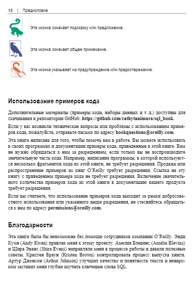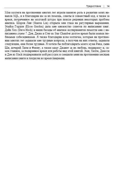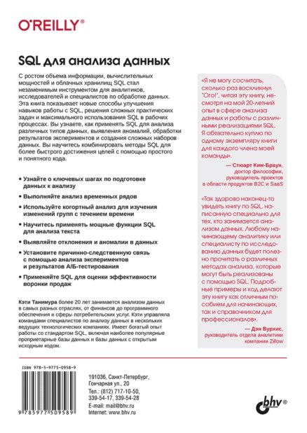 Рассказывается о возможностях SQL применительно к анализу данных. Сравниваются различные типы баз данных, описаны методы подготовки данных для анализа. Рассказано о типах данных, структуре SQL-запросов, профилировнии, структурировании и очистке данных. Описаны методы анализа временных рядов, трендов, приведены примеры анализа данных с учетом сезонности. Отдельные главы посвящены когортному анализу, текстовому анализу, выявлению и обработке аномалий, анализу результатов экспериментов и А/В-тестирования. Описано создание сложных наборов данных, комбинирование методов анализа. Приведены практические примеры анализа воронки продаж и потребительской корзины.