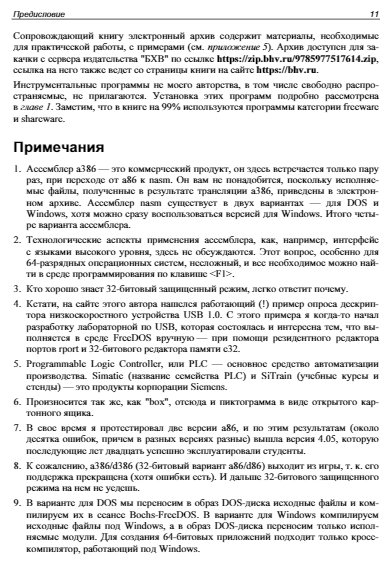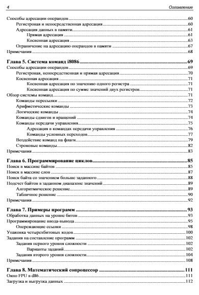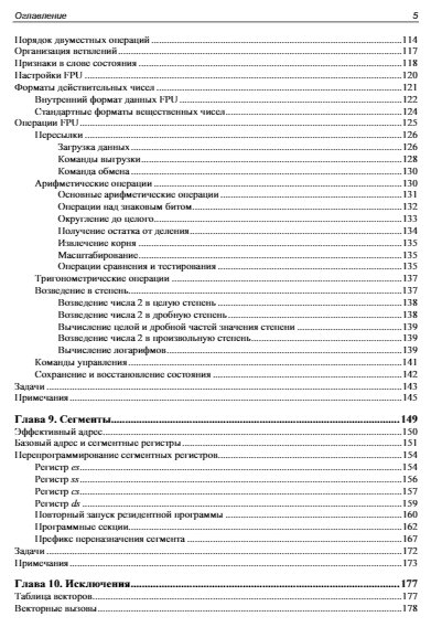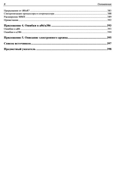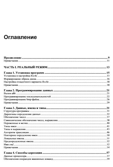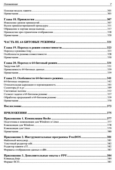 Книга является практическим пособием по программной модели процессоров i80x86/64. Простейшие элементы этой модели (переменные, константы, методы адресации и система команд) изучаются с помощью ассемблера a86, отладчика d86. 32-битные возможности i80x86, включая защищенный режим, вентили, исключения и прерывания, привилегии, страничное преобразование, исключения, LDT и TSS, а также 64-битные режимы процессора x64 с исключениями и прерываниями в long mode изучаются с использованием ассемблера nasm.