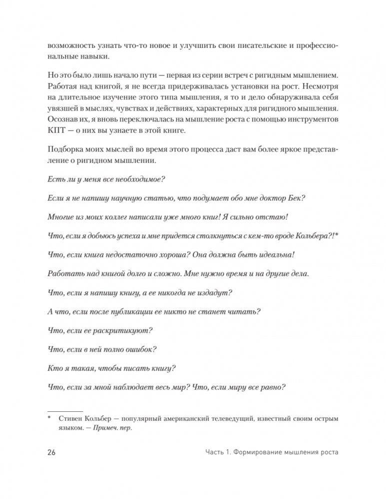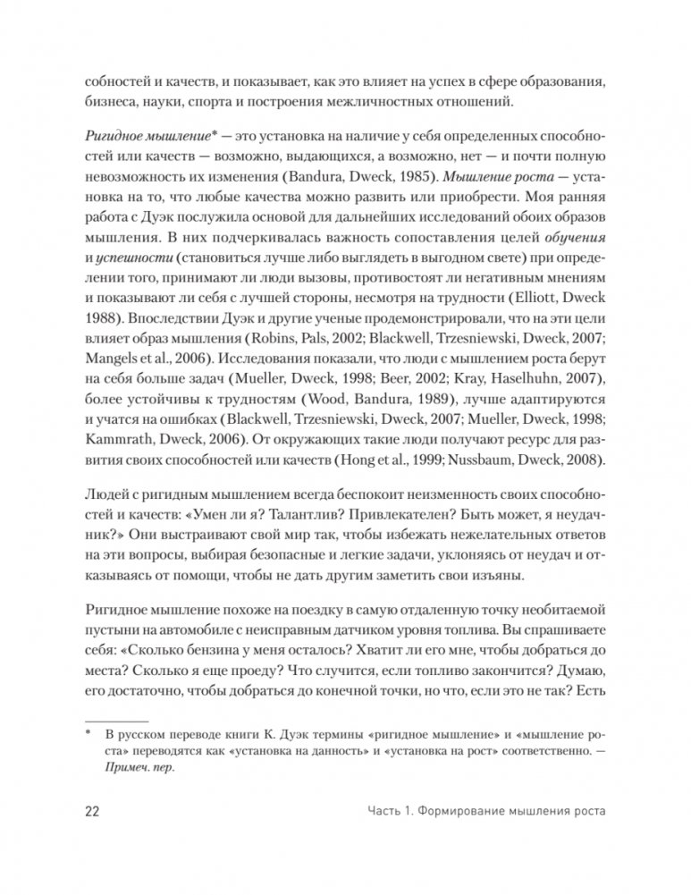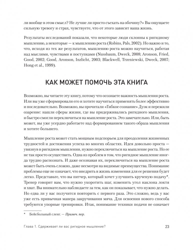 В своей более чем двадцатилетней практике Элейн Эллиотт-Москва наблюдала, что далеко не все люди, стремящиеся к саморазвитию, достигают успеха. Она обнаружила, что дело не только в намерении и мотивации человека, но и в том, какое у него мышление. Книга помогает читателям избавиться от самоограничивающих установок и убеждений ригидного мышления и заменить их мышлением роста, которое повысит устойчивость и уверенность в себе, сформирует основу для изменения жизни. В книге также представлено множество практик и упражнений из КПТ.