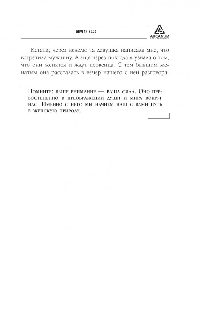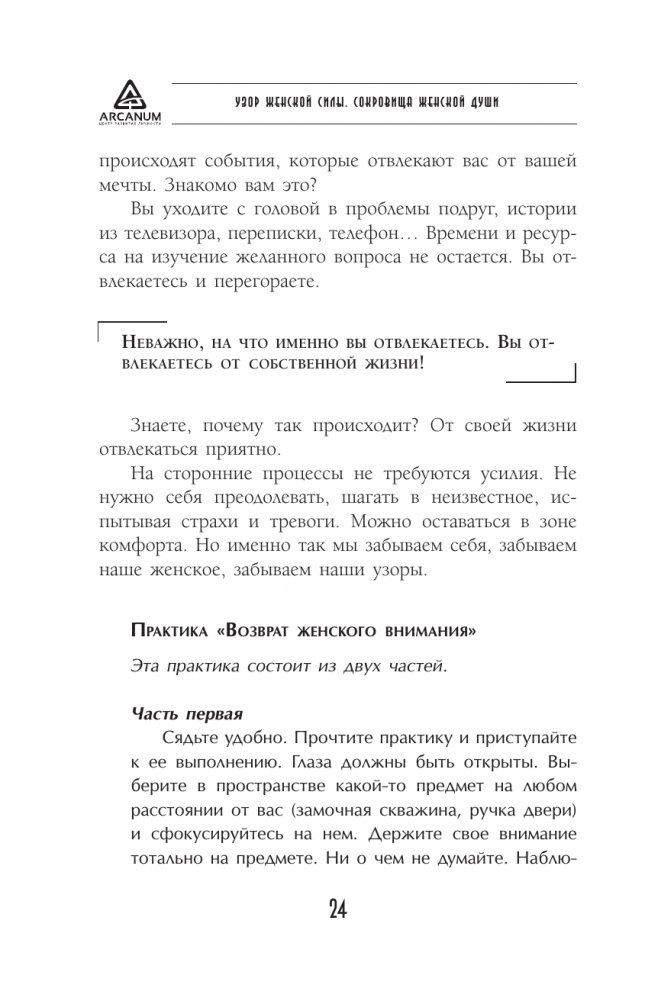 Наша женская суть соткана из самых разных воспоминаний, надежд, мечтаний, событий, лиц. Все это уникальным образом откликается в нас, формируя в душе каждой женщины особое чувствование мира, схожее с узором на полотне. Узор женской силы — это вера и знания, свет и тень, поддержка рода и собственный путь каждой женщины. Соревнуясь с мужчинами за карьерный рост или статус победителя, женщина часто забывает о своей природе. А ведь ее главная сила всегда скрыта в ней самой. Принять эту силу — значит позволить своим желаниям самостоятельно постучаться в наши двери. Как быть в контакте со своими чувствами и эмоциями? Возможно ли восполнить свой запас энергии? Каким образом получать помощь от силы рода? Почему важно не нарушать границы других и оберегать свои? Сложно ли обрести такой навык, как эмпатия? Ответы на эти и другие вопросы, а также множество практических упражнений дает в своей книге Ольга Найдёнова. Ольга — инструктор Центра развития личности Arcanum, женский тренер, практик, психолог с многолетним опытом. Обретя собственную самость и найдя свое предназначение, она несет в этот мир знания, которые получили и успешно применяют в жизнь десятки тысяч довольных учениц. Может быть, пришло и ваше время вспомнить о подлинных сокровищах, хранящихся в вашей женской душе?