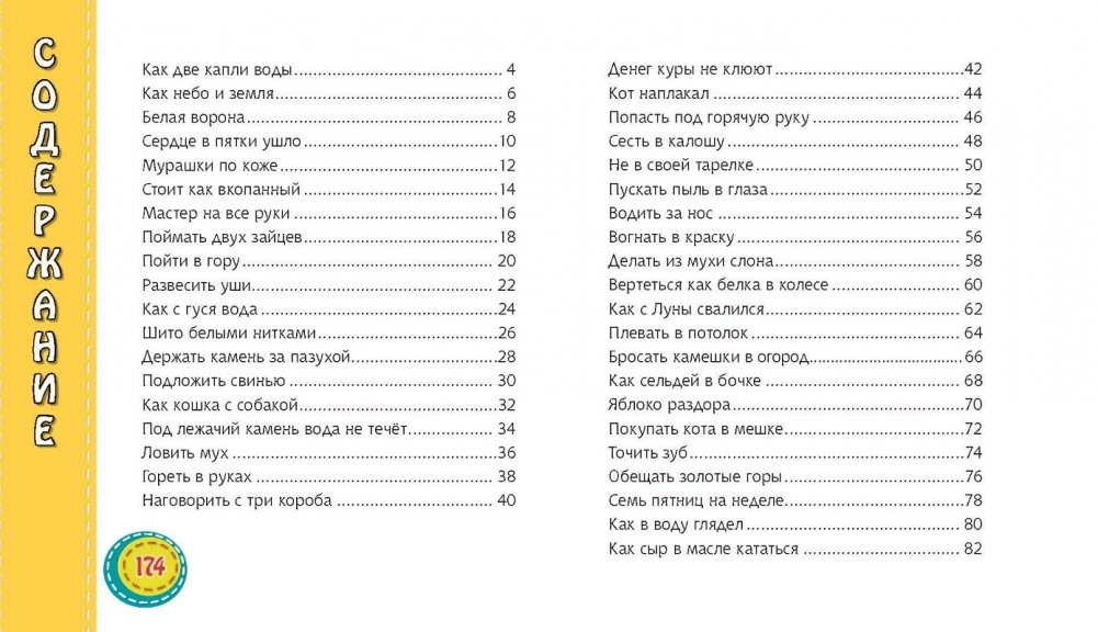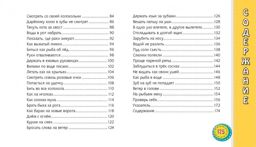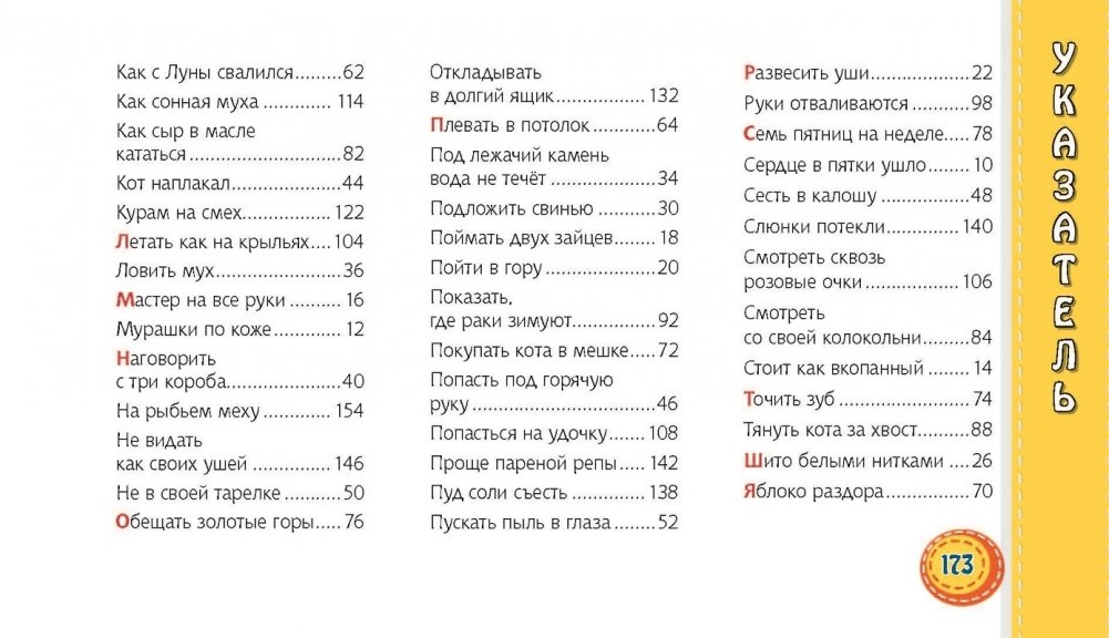 Книга представляет собой уникальный фразеологический словарь в картинках и позволяет овладевать языковыми знаниями в увлекательной игровой форме. Содержит толкования наиболее распространённых фразеологизмов русского языка, а также занимательные развивающие и тренировочные упражнения, направленные на их запоминание и усвоение. Яркие и весёлые рисунки помогут понять переносное значение фразеологических выражений и научиться употреблять их в речи, а также будут способствовать обогащению словарного запаса детей.