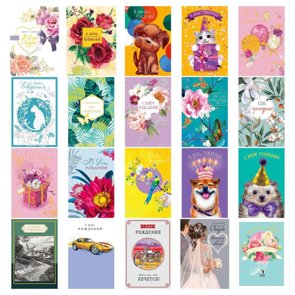 Открытка — подарок от сердца. Её всегда приятно получить и хочется сохранить. Открытки по самым разным поводам для родных, друзей, коллег и не только. Сдержанный дизайн или эффектная отделка, лаконичное пожелание или душевные стихи… Каждый выберет то, что ему по душе! 20 дизайнов в коробе по 5 шт. Размер изделия: 121х183 мм.