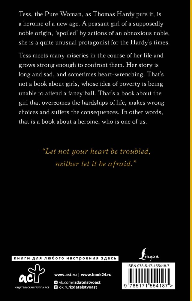 Томас Гарди - английский писатель-романист XIX-XX вв. Его романы "Тэсс из рода д’Эрбервиллей", "Вдали от обезумевшей толпы", "Джуд Незаметный" и многие другие снискали давнее признание и обрели множество экранизаций. "Тэсс" рассказывает о трагической судьбе крестьянской девушки, принадлежавшей к древнему рыцарскому роду. Но вместе с благородным происхождением Тесс обрела и много бед.