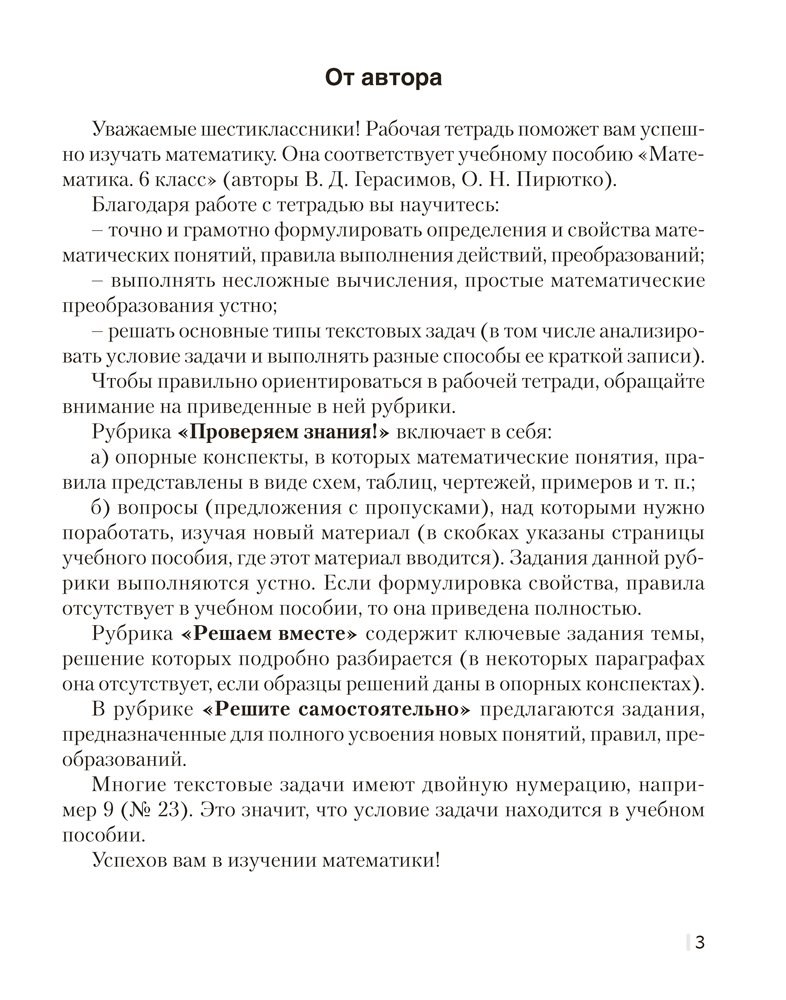 Рабочая тетрадь соответствует учебной программе и учебному пособию по математике для 6 класса авторов В. Д. Герасимова и О. Н. Пирютко. В ней собраны тренировочные упражнения, которые помогут учащимся легко и быстро усвоить новый материал. Наличие образцов выполнения заданий, частично сделанные записи вычислений, специальные задания на уяснение отдельных этапов вычислений — все это позволит разнообразить виды учебной деятельности на основе компетентностного подхода.
