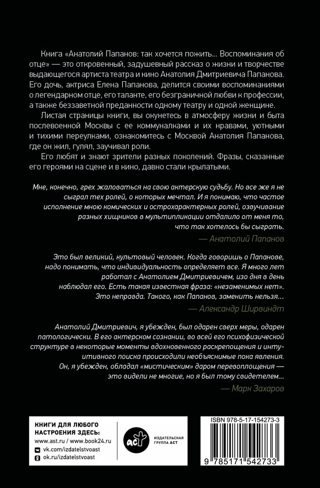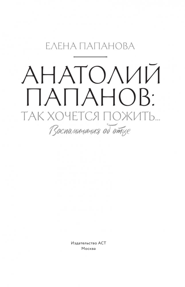 Книга "Анатолий Папанов: так хочется пожить... Воспоминания об отце" — это откровенный, задушевный рассказ о жизни и творчестве выдающегося актера театра и кино Анатолия Дмитриевича Папанова.