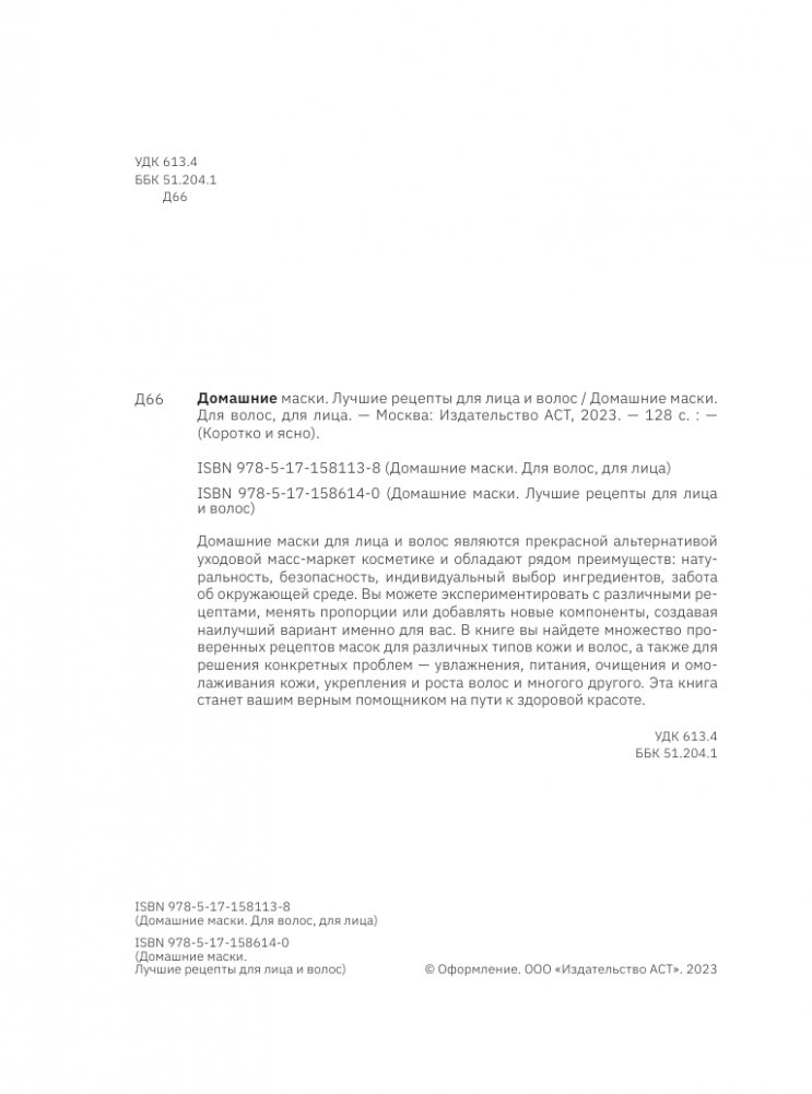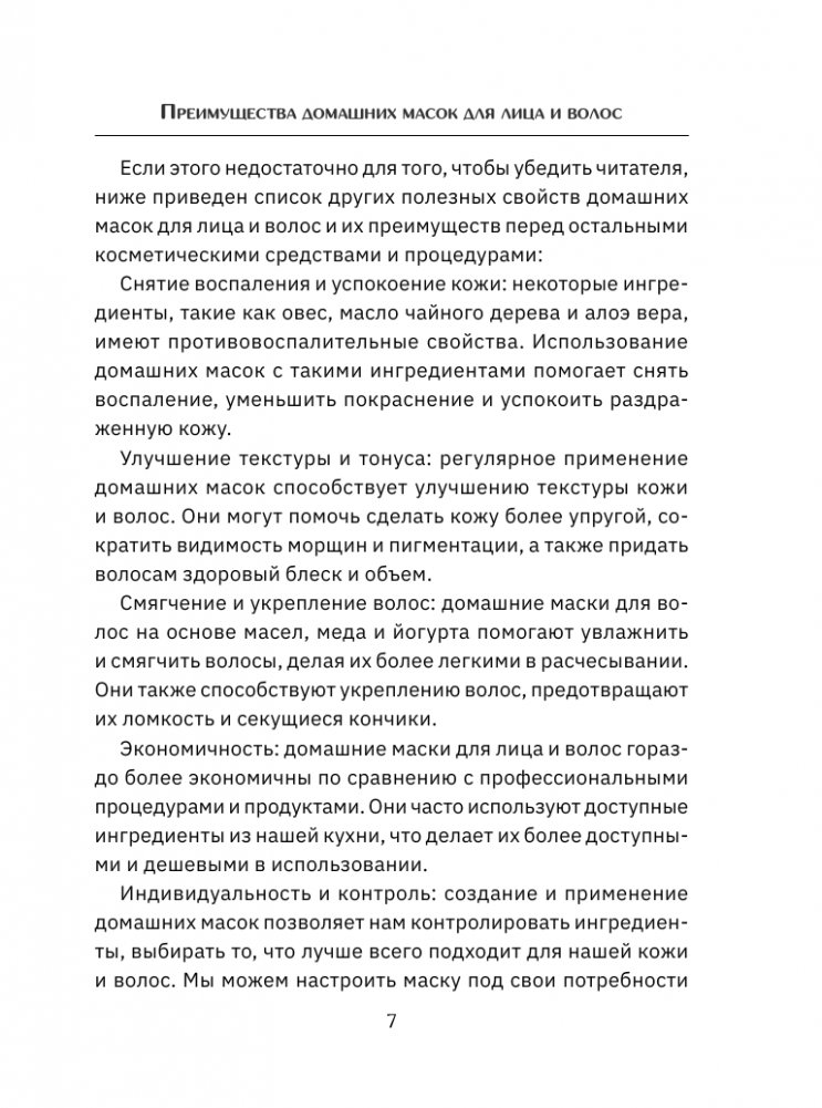 Домашние маски для лица и волос являются прекрасной альтернативой уходовой масс-маркет косметике и обладают рядом преимуществ: натуральность, безопасность, индивидуальный выбор ингредиентов, забота об окружающей среде. Вы можете экспериментировать с различными рецептами, менять пропорции или добавлять новые компоненты, создавая наилучший вариант именно для вас. В книге вы найдете множество проверенных рецептов масок для различных типов кожи и волос, а также для решения конкретных проблем - увлажнения, питания, очищения и омолаживания кожи, укрепления и роста волос и многого другого. Эта книга станет вашим верным помощником на пути к здоровой красоте.