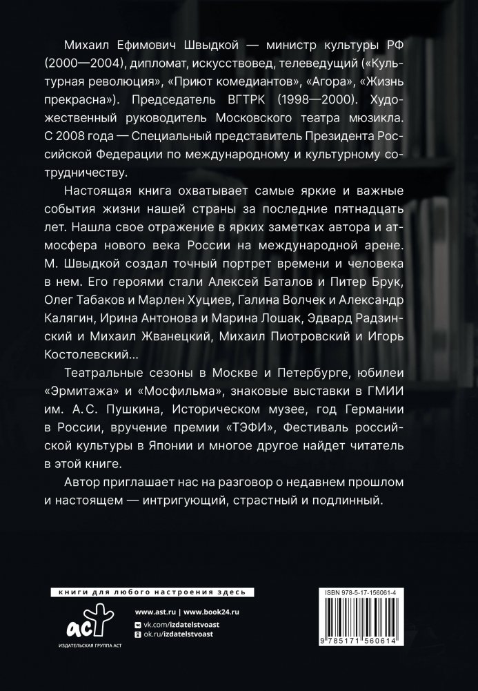 Настоящая книга охватывает самые яркие и важные события жизни нашей страны за последние пятнадцать лет. Нашла свое отражение в ярких заметках автора и атмосфера нового века России на международной арене. М. Швыдкой создал точный портрет времени и человека в нем. Его героями стали Алексей Баталов и Питер Брук, Олег Табаков и Марлен Хуциев, Галина Волчек и Александр Калягин, Ирина Антонова и Марина Лошак, Эдвард Радзинский и Михаил Жванецкий, Михаил Пиотровский и Игорь Костолевский...