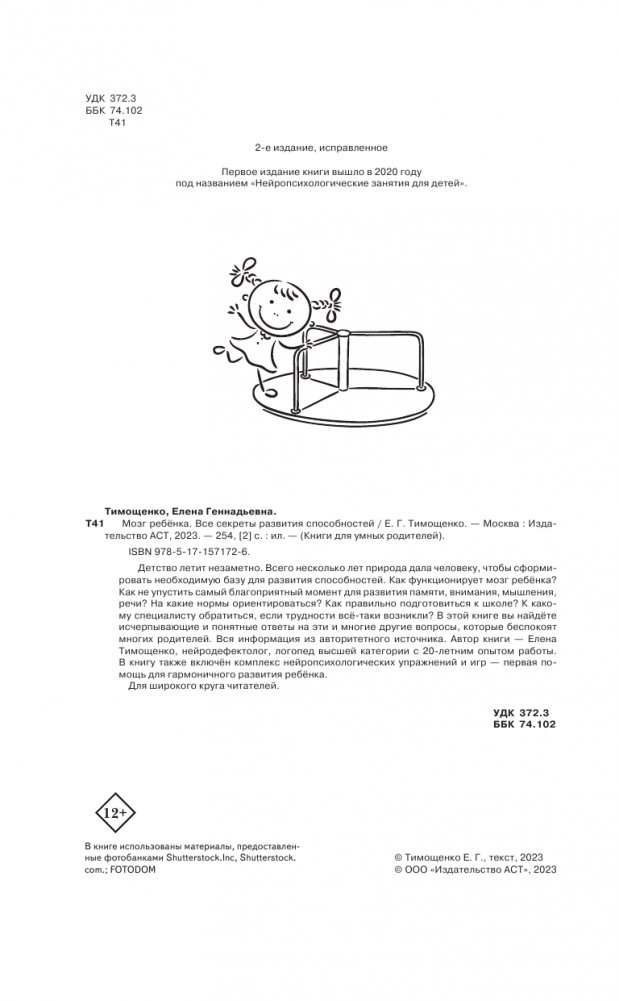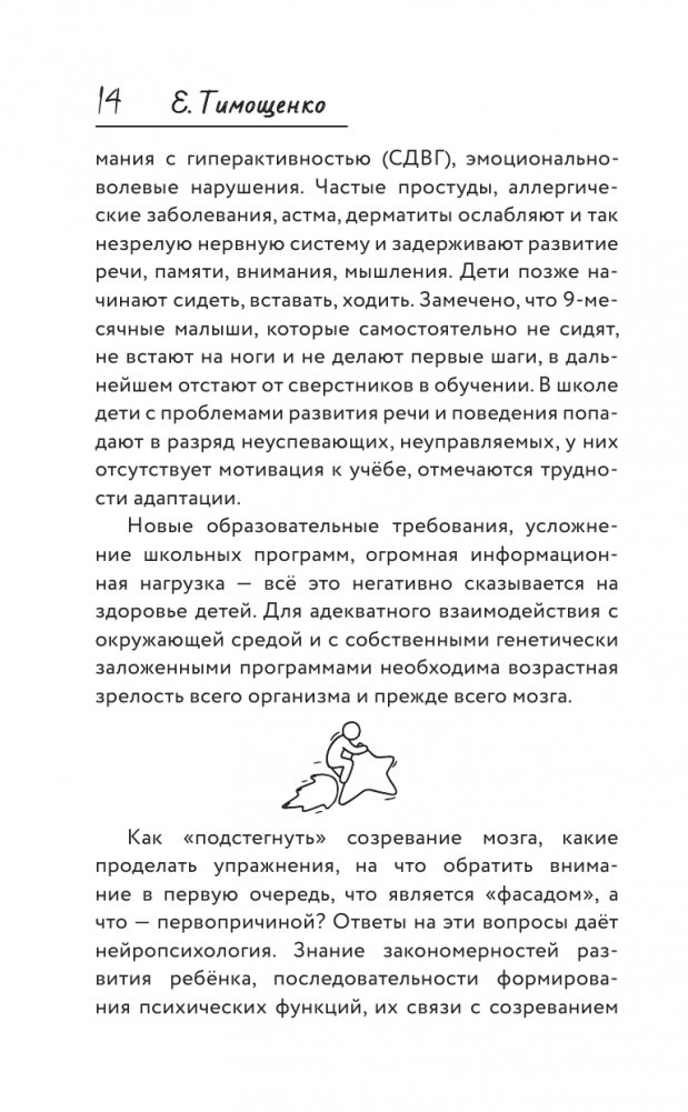 Детство летит незаметно. Всего несколько лет природа дала человеку, чтобы сформировать необходимую базу для развития способностей. Как функционирует мозг ребенка? Как не упустить самый благоприятный момент для развития памяти, внимания, мышления, речи? На какие нормы ориентироваться? Как правильно подготовиться к школе? К какому специалисту обратиться, если трудности все-таки возникли? В этой книге вы найдете исчерпывающие и понятные ответы на эти и многие другие вопросы, которые беспокоят многих родителей. Вся информация из авторитетного источника. Автор книги — Елена Тимощенко, нейродефектолог, логопед высшей категории с 20-летним опытом работы, создатель обучающих курсов для родителей и специалистов. В книгу также включен комплекс нейропсихологических упражнений и игр — первая помощь для гармоничного развития ребёнка.