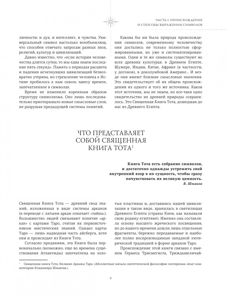 Символический язык — язык универсальный. Мы встречаем символы выбитыми на камнях древних храмов, в ритуалах Посвящений, во всех Священных Писаниях, запечатленными в таинственных формах сфинксов Ассирии и Египта, скрытыми в ошеломляющих пропорциях пирамид, в загадочных эмблемах старинных алхимических книг, видим их в изобразительном искусстве и художественной литературе. И всюду они тождественны, хотя и несут на себе отпечатки культуры и традиций разных народов.