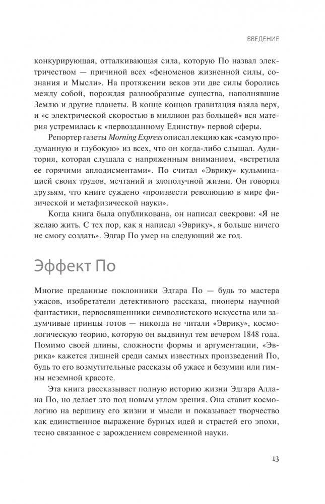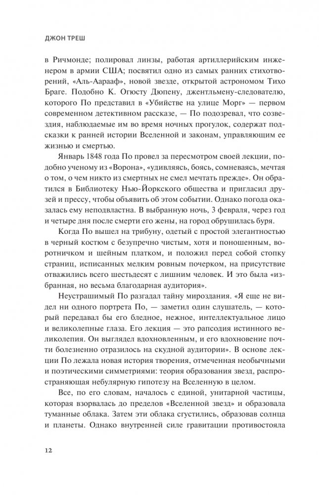 Треш показывает, что По жил, думал и страдал в окружении науки, а многие из его самых известных творческих работ лучше всего рассматривать через ее призму. Преследуя экстраординарные догадки и уникальное эстетическое видение, По оставался фигурой взрывоопасного противоречия: он с радостью разоблачал мистификации научных мошенников эпохи, даже когда сам мастерски совершал их в своих романах.