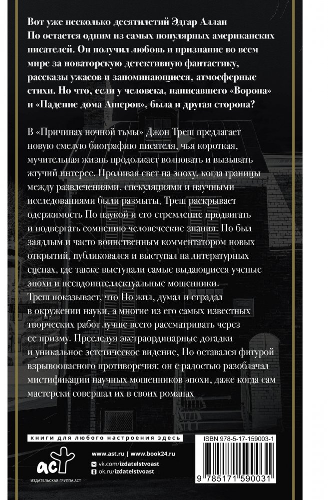 В "Причинах ночной тьмы" Джон Треш предлагает новую смелую биографию писателя, чья короткая, мучительная жизнь продолжает волновать и вызывать жгучий интерес. Проливая свет на эпоху, когда границы между развлечениями, спекуляциями и научными исследованиями были размыты, Треш раскрывает одержимость По наукой и его стремление продвигать и подвергать сомнению человеческие знания. По был заядлым и часто воинственным комментатором новых открытий, публиковался и выступал на литературных сценах, где также выступали самые выдающиеся ученые эпохи и псевдоинтеллектуальные мошенники.