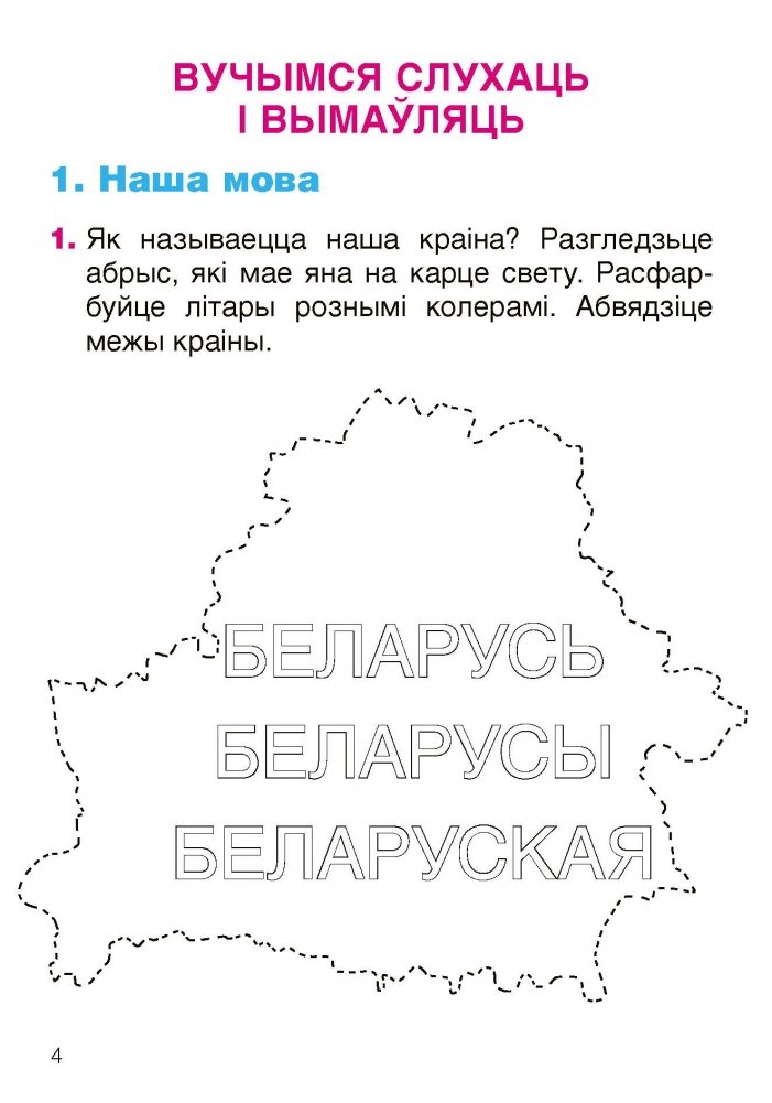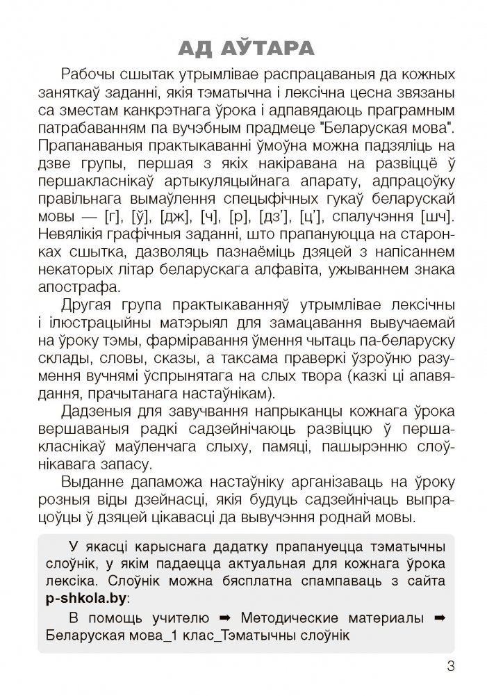 Рабочы сшытак утрымлівае распрацаваныя да кожных заняткаў заданні, якія тэматычна і лексічна цесна звязаны са зместам канкрэтнага ўрока і адпавядаюць праграмным патрабаванням па вучэбным прадмеце “Беларуская мова”. Прапанаваныя практыкаванні ўмоўна можна падзяліць на дзве групы, першая з якіх накіравана на развіццё ў першакласнікаў артыкуляцыйнага апарату, адпрацоўку правільнага вымаўлення спецыфічных гукаў беларускай мовы — [г], [ў], [дж], [ч], [р], [дз’], [ц’], спалучэння [шч]. Невялікія графічныя заданні, што прапануюцца на старонках сшытка, дазволяць пазнаёміць дзяцей з напісаннем некаторых літар беларускага алфавіта, ужываннем знака апострафа.