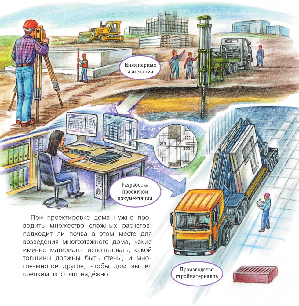Добро пожаловать в увлекательное путешествие в мир дорожной и строительной техники! Здесь вам встретятся огромные краны, бульдозеры и асфальтоукладчики, экскаваторы, катки и бетономешалки… Эта книга расскажет о том, с чего и как начинается постройка здания, как происходит закладка фундамента, какая техника помогает рыть котлован, поднимать тяжёлые плиты, проводить электричество и водопровод, для чего нужны чертежи и планы... и ещё о многом-многом другом!