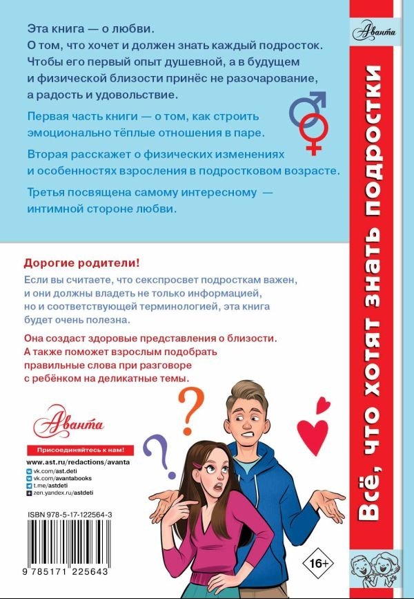 Эта книга для подростков о взрослении, любви и сексуальной грамотности, открытый и искренний разговор на темы, которые волнуют каждого подростка: что происходит с моим телом и нормально ли то, что ощущаю; как выражать свои чувства к тому, кто нравится и как развивать любовные отношения; что нужно знать об интимной близости и как заботиться о своем здоровье и безопасности.