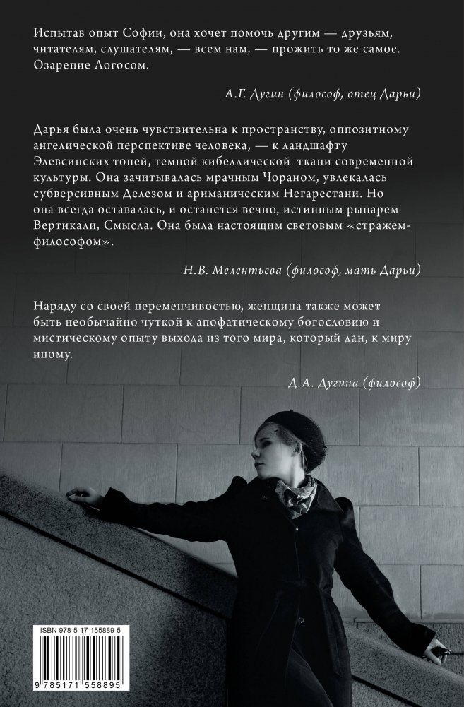 Книга философа-традиционалиста Дарьи Дугиной знакомит читателей с ее философскими идеями, с ее прочтением классического наследия философии, и прежде всего неоплатонизма, и современных авторов, с ее оригинальным учением "эсхатологического оптимизма". Книга составлена из научных статей автора, расшифровки ее лекций, семинаров и выступлений перед различными аудиториями. Это произведение является образцом огненного служения идеалам Традиции и духовным памятником борьбы против современного мира, что сама Дарья считала своей философской судьбой. Дарья Дугина трагически погибла 20 августа 2022 года.