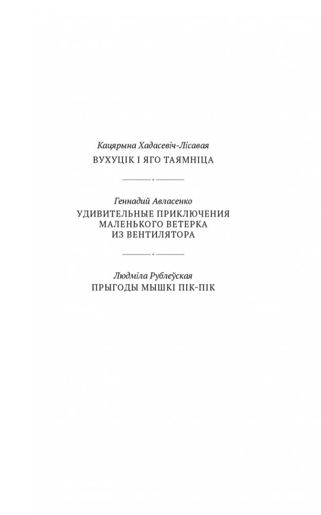 Новая кніга з серыі «Сучасная беларуская літаратура» ўключае творы Кацярыны Хадасевіч-Лісавой, Генадзя Аўласенкі і Людмілы Рублеўскай. Пісьменнікі добра ведаюць дзіцячую псіхалогію, умеюць размаўляць з чытачом на мове дзяцінства і робяць гэта без лішняй дыдактыкі і гучных павучанняў.