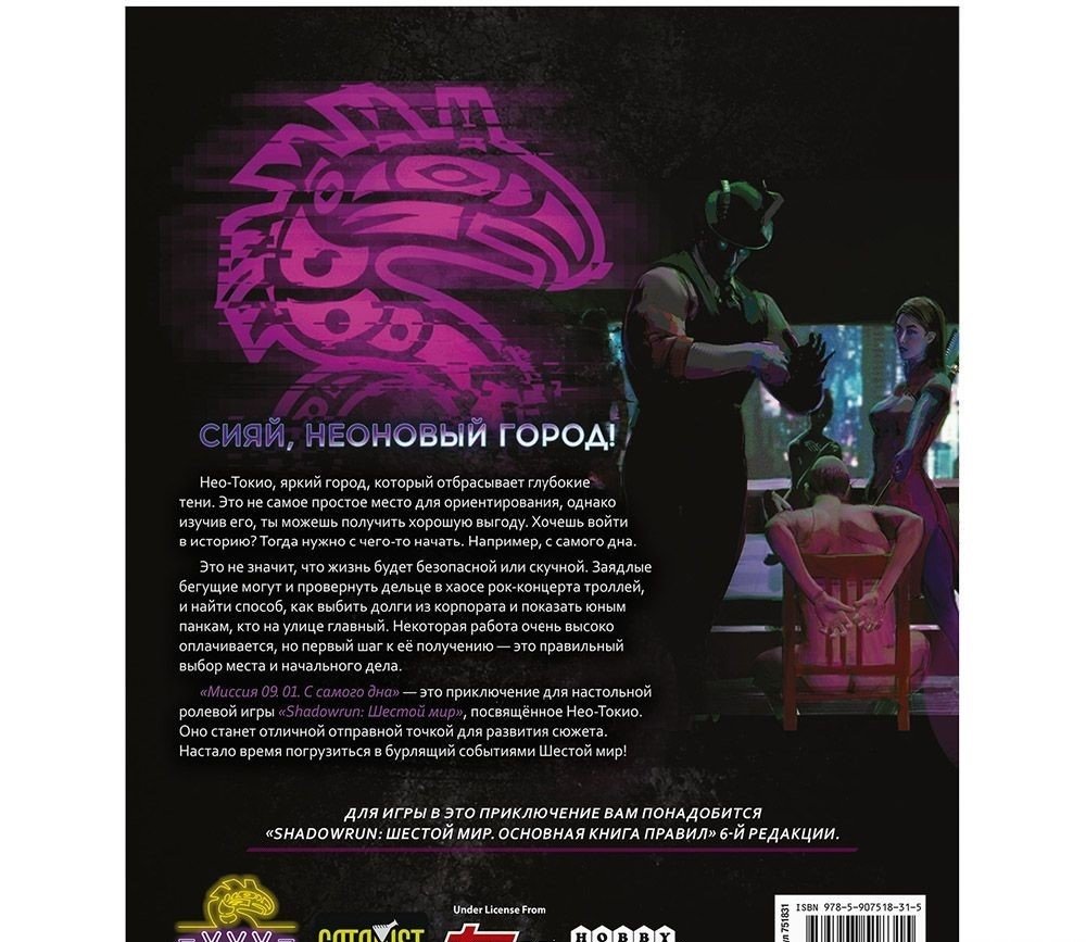 "Миссия 09.01. С самого дна" – это приключение для настольной игры "Shadowrun: Шестой мир", и первая часть серии миссий, посвящённых Нео-Токио. Эта история станет отличной отправной точкой для вашей кампании – так что самое время направляться в Японию в поисках лучшей жизни! Вас ждёт настоящий водоворот событий Шестого мира, в котором воедино сплелись технологии, магия и суровый закон улиц. Начав с поиска выгодной работы, вы ступите на тернистый путь бегущих – выбивайте долги из корпоратов, пытайтесь сориентироваться в хаосе рок-концерта троллей и покажите миру, чего вы стоите!