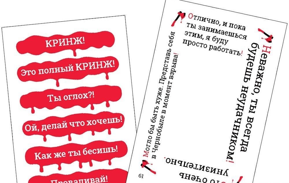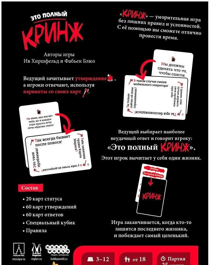 Чел, ты... Да вы просто обязаны сыграть в эту игру! Апофеоз кукожа, стыд настолько испанский, что убежал на корриду после концерта фламенко... Правил – минимум, веселья – максимум! Суть игры невероятно проста: игрокам нужно выбирать ответы со своих карточек, подбирая их под утверждение ведущего. Тот, кто подберёт самый кринжовый ответ, лишается единицы жизни, и когда чья-то жизнь подходит к концу, игра заканчивается и объявляется победитель – тот, кто избегал кринжа до последнего.