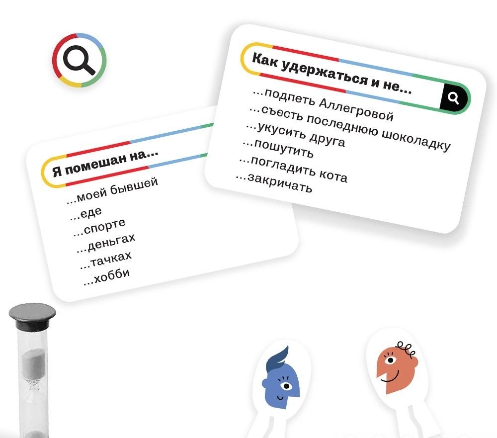 Вы только что узнали, как выглядит структура всех карт в игре – это начало запроса и несколько вариантов продолжения, которые может предложить вам поисковик. Перемешайте карты запросов, разместите красный и синий жетоны команд на ячейках "Старт", случайным образом определите ведущего, а остальных игроков поделите на 2 команды. Вы готовы к игре! Ведущий берёт одну карту, зачитывает начало запроса и переворачивает песочные часы. Обратный отсчёт пошёл! За 40 секунд команды должны назвать как можно больше правильных вариантов поисковых запросов, которые указаны на карте ведущего. Если последний услышал близкий ответ к одному из вариантов, то берёт жетон правильного ответа и кладёт перед игроком, назвавшим его. Больше за этот ответ жетон получить нельзя. Раунд заканчивается вместе с последней песчинкой упавшей на дно часов. Или когда все варианты с карты ведущего будут названы. Теперь команды считают количество заработанных жетонов – на их количество жетоны команд продвигаются по треку победных очков.