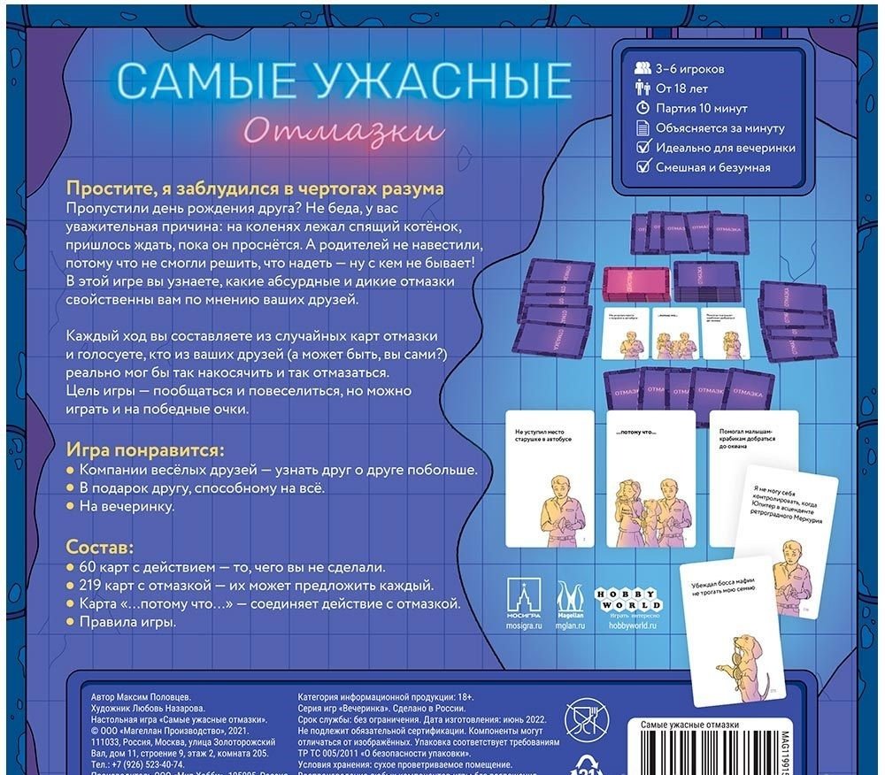 "Самые ужасные отмазки" – это простая и весёлая игра для компании, продолжающая "Самого ужасного человека". Суть игры очень проста: есть ситуации, в которые вы влипли, а есть отмазки, которые вы пробуете использовать для своего оправдания. Игроки по очереди зачитывают, что именно у них не получилось, а другие выбирают подходящие по их мнению отмазки. После выбора самой смешной вы решаете, кто из вас реально мог бы так оправдываться – и вы вполне вероятно узнаете много нового о себе и своих друзьях!